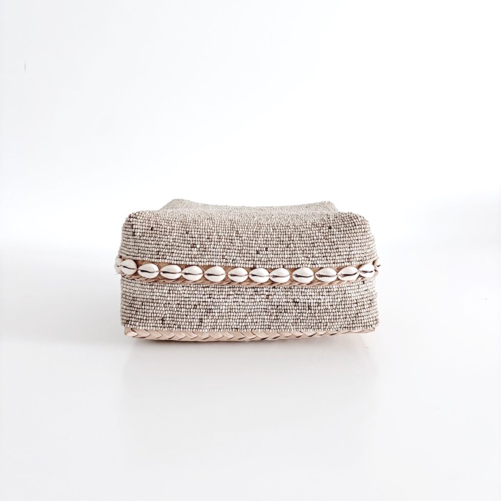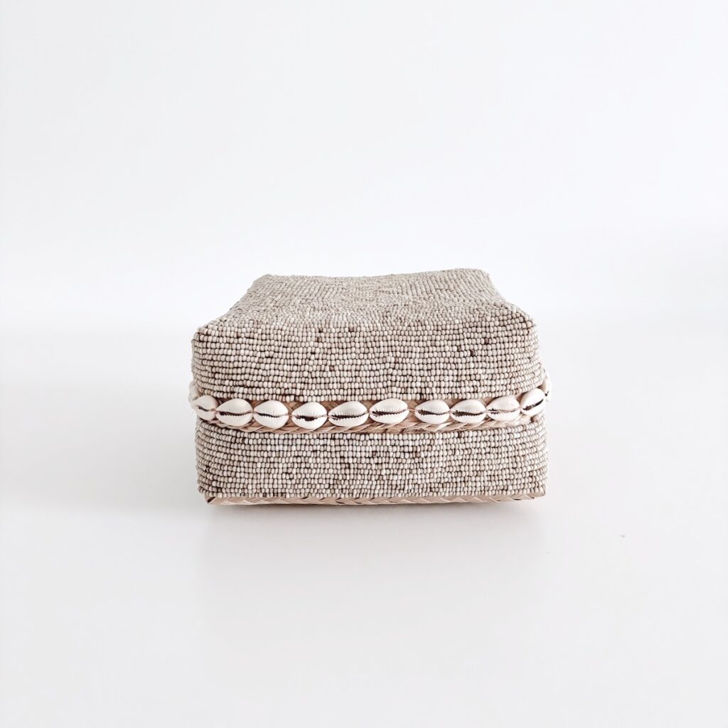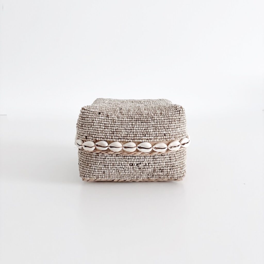De smukke, traditionelle kurveæsker er håndflettet på Bali i palmeblade. Udenpå er æskerne oversået med et hav af små perler og ægte konkylier, der er manuelt påsyet. Konkylierne er indsamlet på Bali’s smukke strande med godkendelse fra lokale og internationale miljøorganisationer.