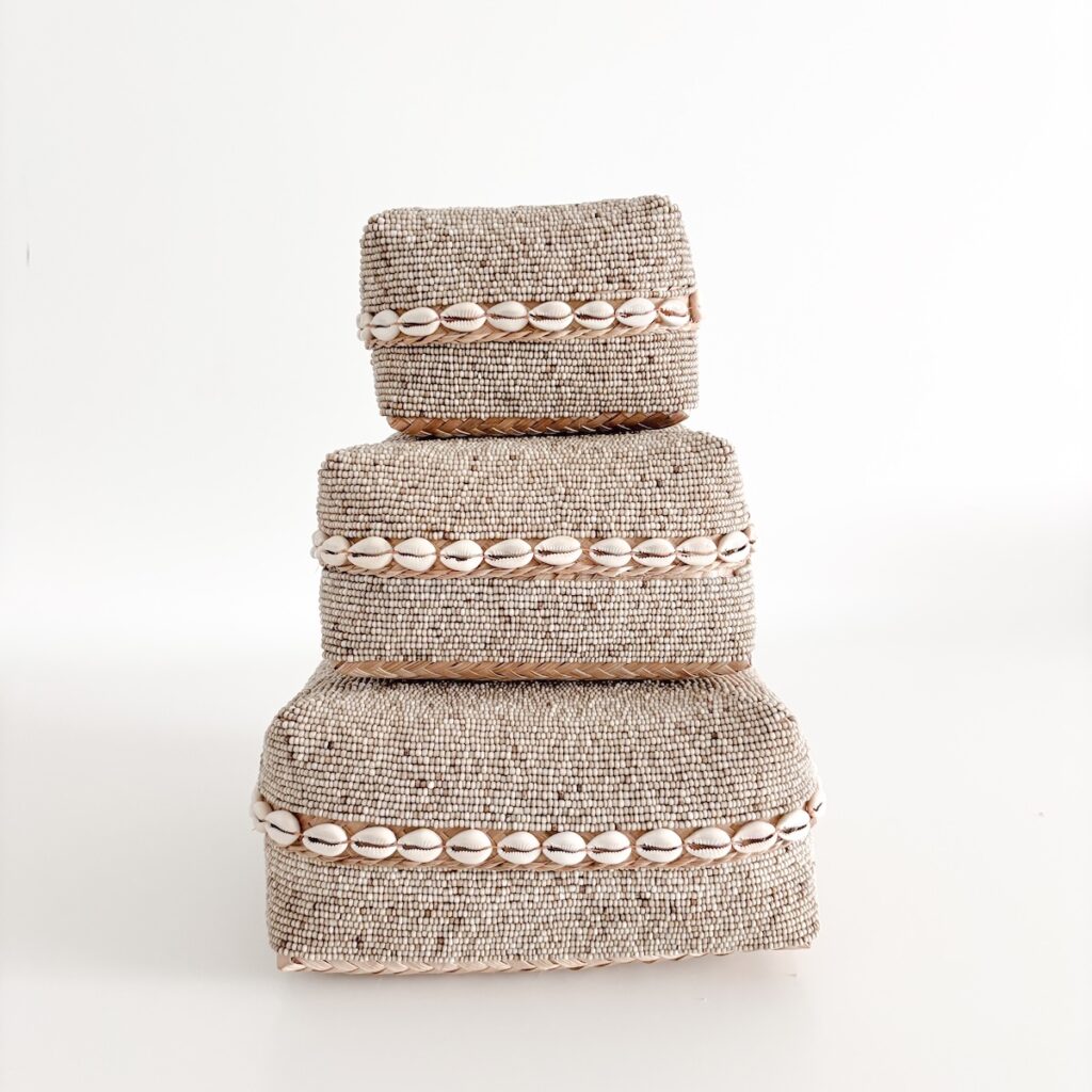 De smukke, traditionelle kurveæsker er håndflettet på Bali i palmeblade. Udenpå er æskerne oversået med et hav af små perler og ægte konkylier, der er manuelt påsyet. Konkylierne er indsamlet på Bali’s smukke strande med godkendelse fra lokale og internationale miljøorganisationer.