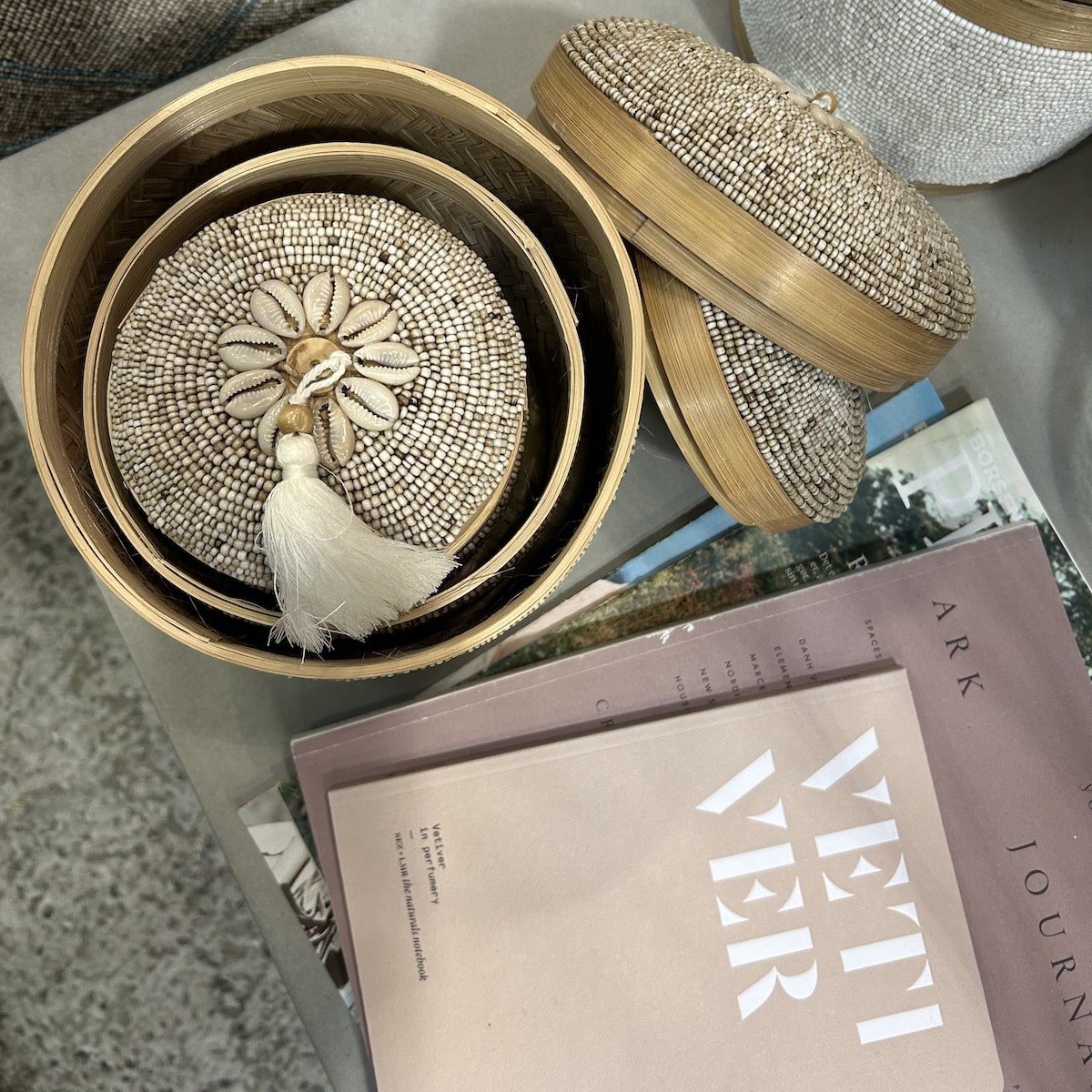 OPRINDELSE: Æsken er håndflettet på Bali og hver perle er påsyet i hånden. Selve æsken anvendes oprindeligt til opbevaring af ris og andre madvarer mens den med perler påsyet anvendes til opbevaring af forskellige ting fra dagligdagen.