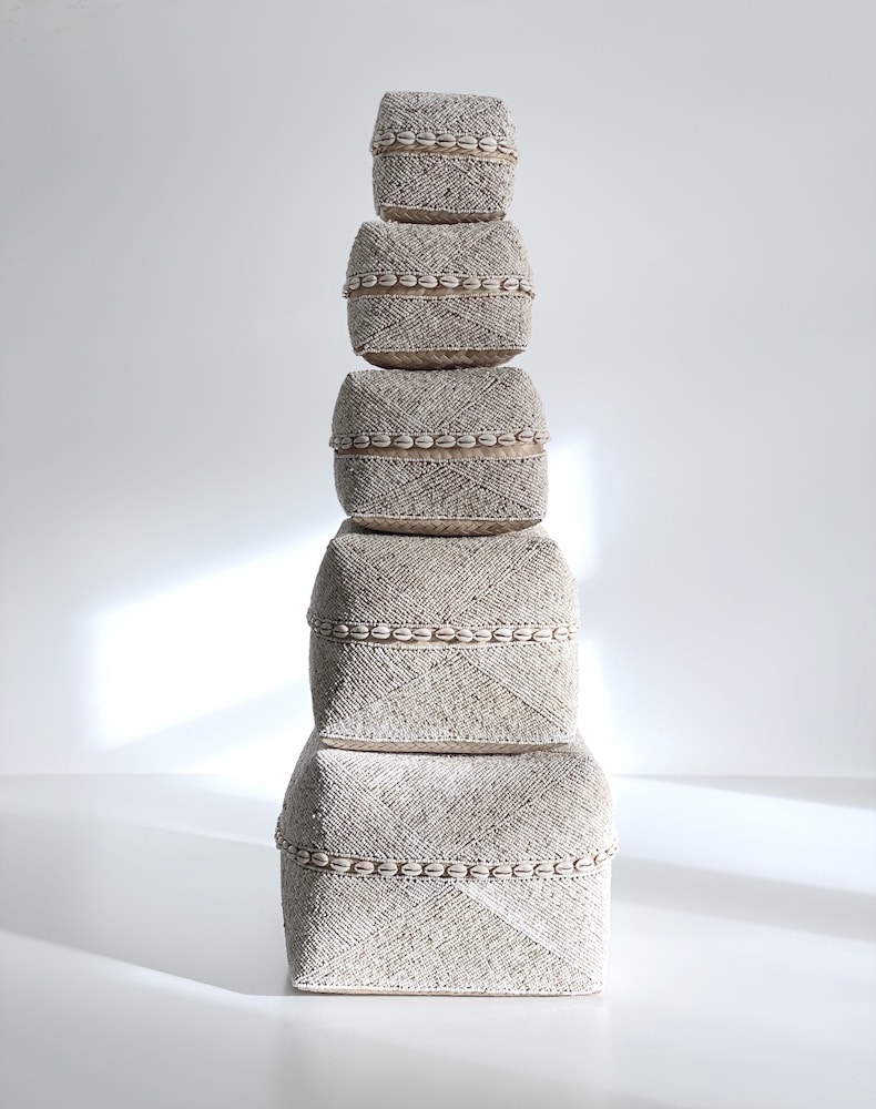 OPRINDELSE: Bali. Æsken er håndflettet af lokale kvinder og hver perle samt konkylie er påsyet i hånden. Selve æsken anvendes oprindeligt til opbevaring af ris og andre madvarer mens den med perler påsyet anvendes til opbevaring af forskellige ting fra dagligdagen.