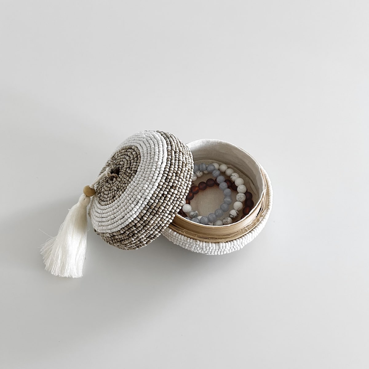 Den smukke kurveæske fra Bali er håndflettet af lokale kvinder i palmeflet med små fine perler påsyet i hånden. Kurvetypen bliver oprindeligt anvendt som opbevaring af madvarer og andre ting i den indonesiske dagligdag; Og med de små perler strøet ud over æskens yderside bliver den utroligt dekorativ at have stående i hjemmet som opbevaring af diverse småting. Den lille æske er foret indvendigt med bomuldsstof i top og bund, der gør den velegnet til smykker. Den er også sød med hårspænder og andre pigeting, småting på badeværelset, clips på kontoret eller lignende. Den er også en sød lille gaveidé til en du holder af. Kurven er lavet i et kraftigt flet og relativt tung, der giver en god stabilitet.