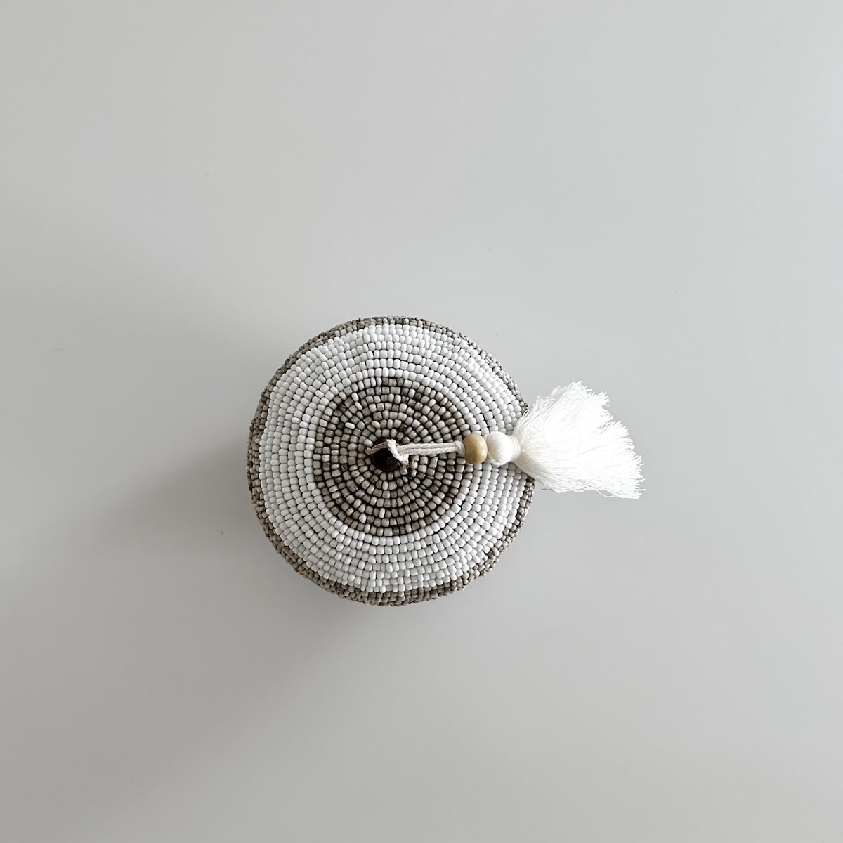 OPRINDELSE: Æsken er håndflettet på Bali og hver perle er påsyet i hånden. Selve æske typen anvendes oprindeligt til opbevaring af ris og andre madvarer mens den med perler påsyet anvendes til pynt og opbevaring af småting