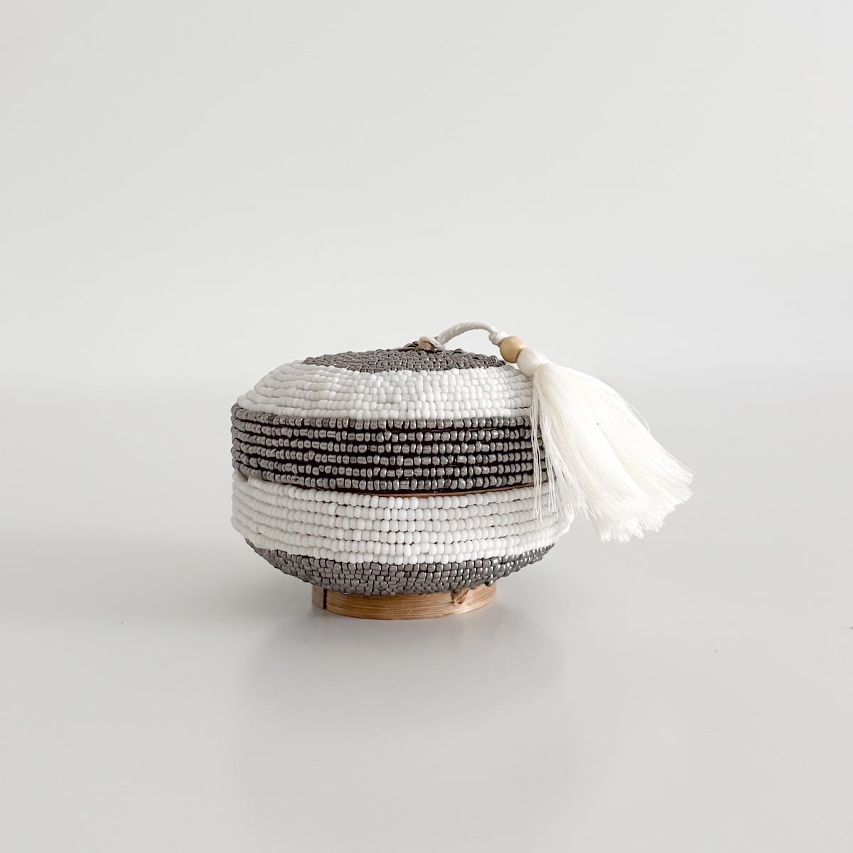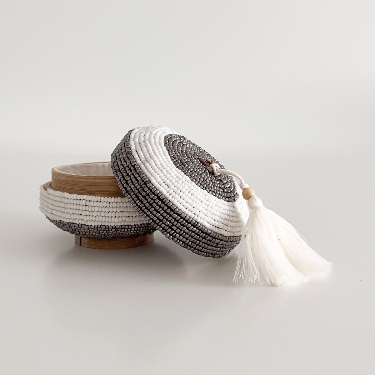 OPRINDELSE: Æsken er håndflettet på Bali og hver perle er påsyet i hånden. Selve æske typen anvendes oprindeligt til opbevaring af ris og andre madvarer mens den med perler påsyet anvendes til pynt og opbevaring af småting