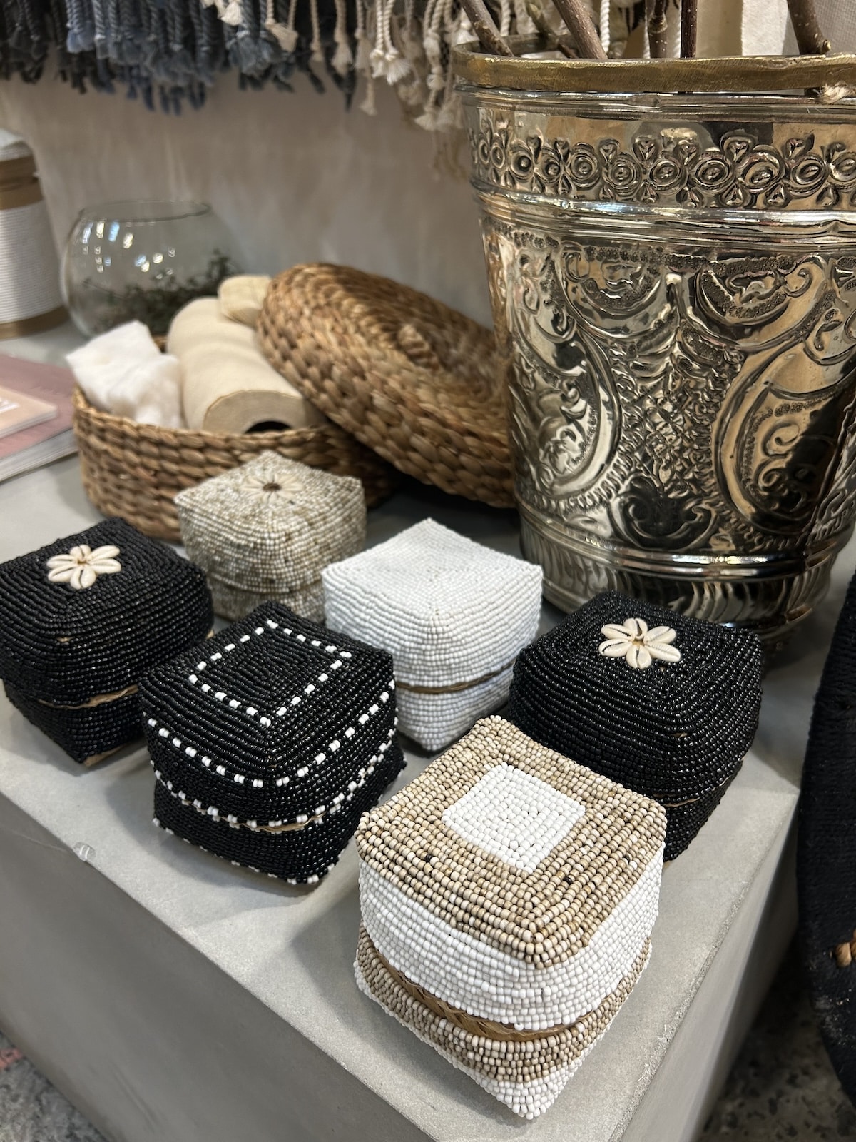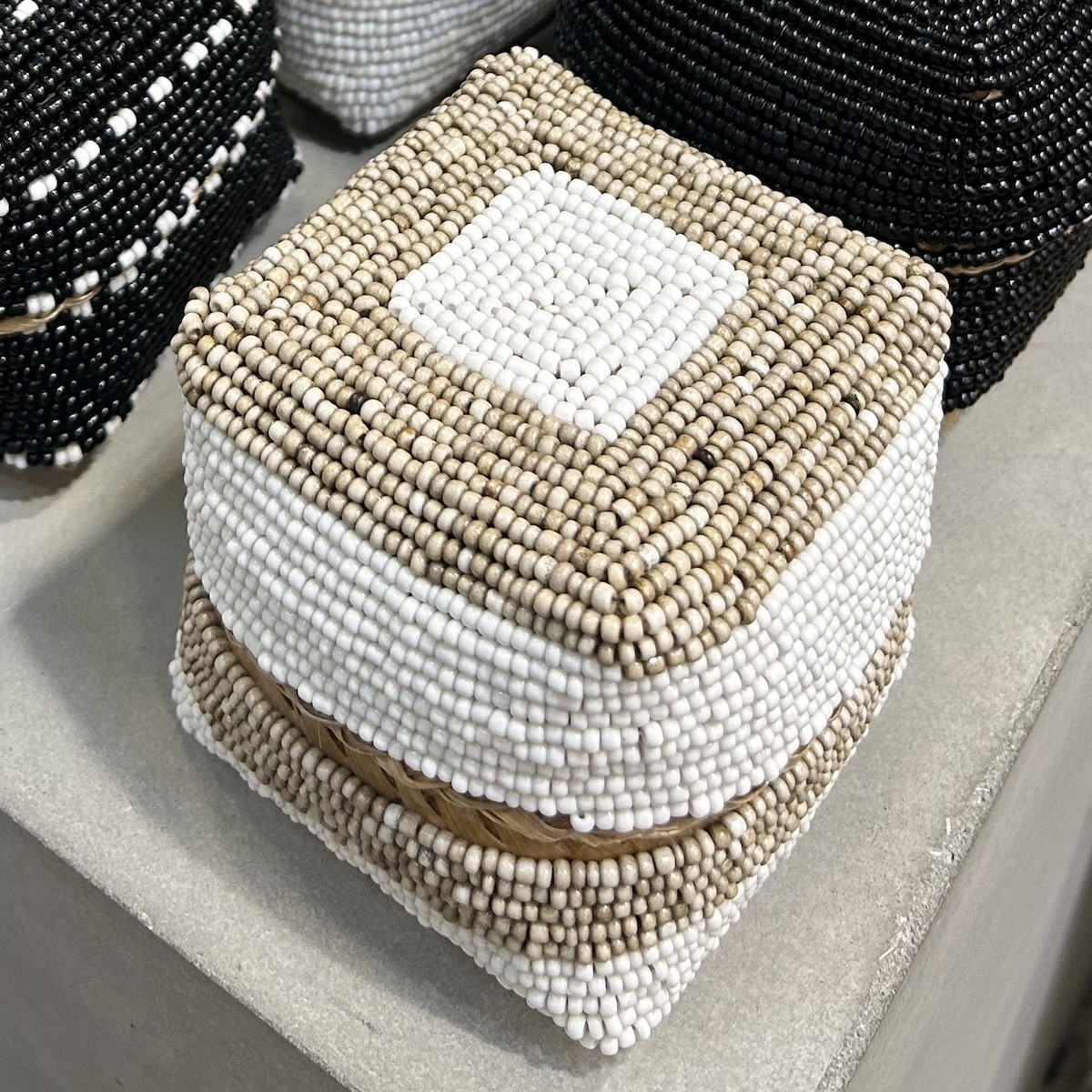 OPRINDELSE: Æsken er håndflettet på Bali og hver perle er påsyet i hånden. Selve æske typen anvendes oprindeligt til opbevaring af ris og andre madvarer mens den med perler påsyet anvendes til pynt og opbevaring af småting