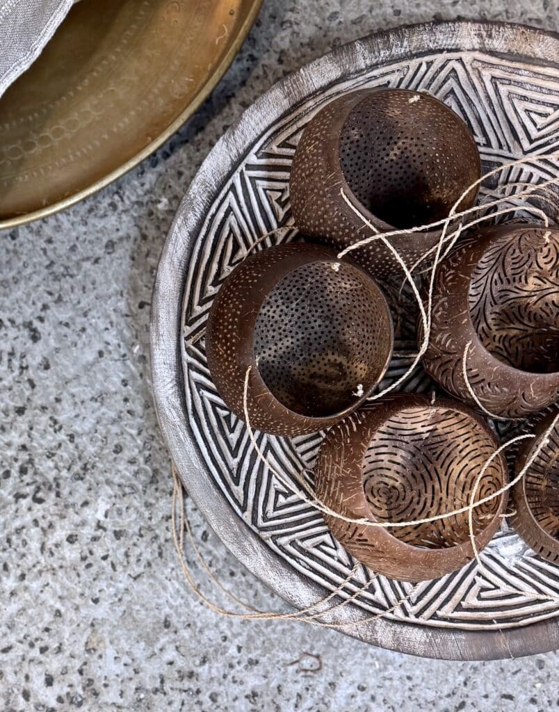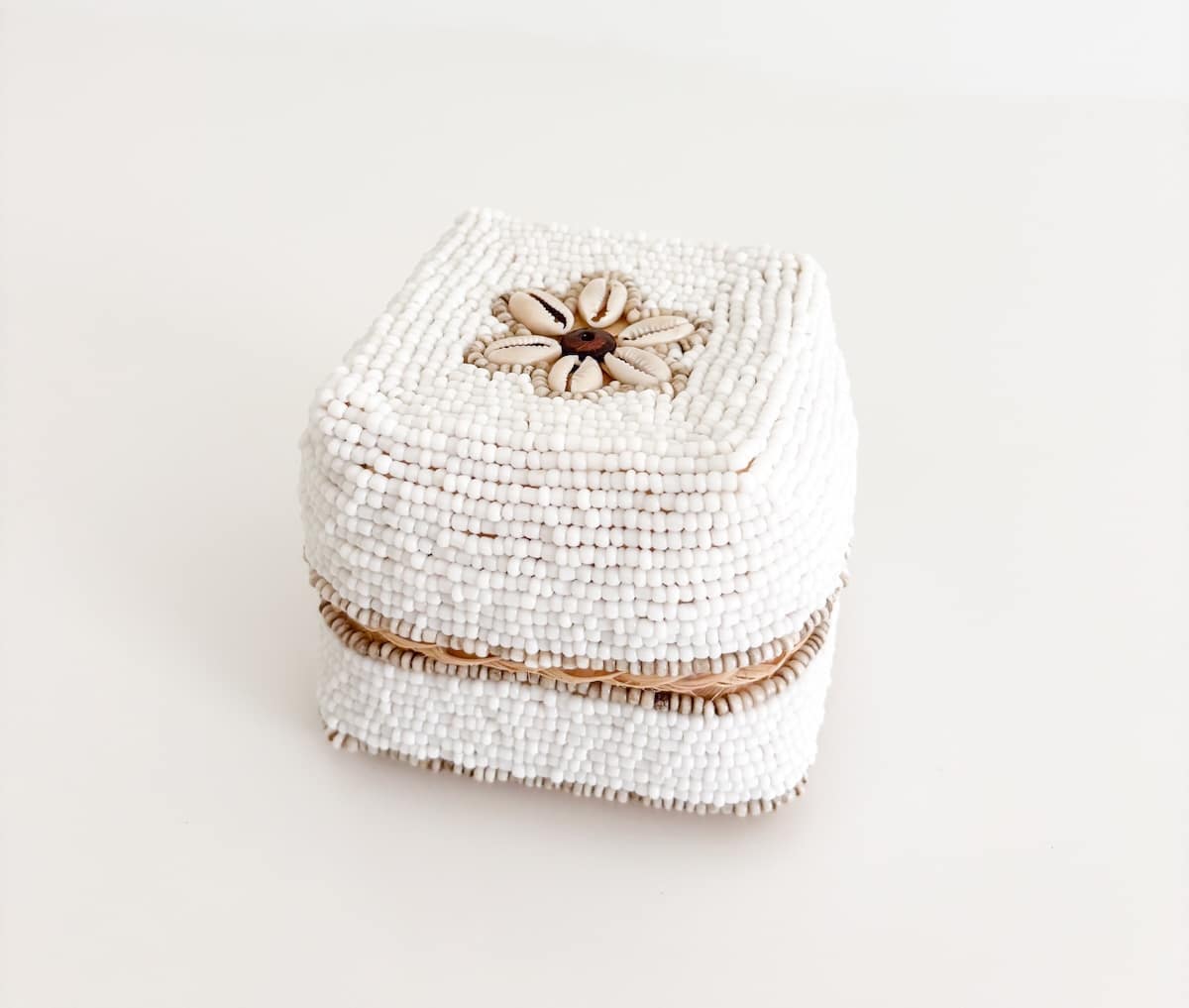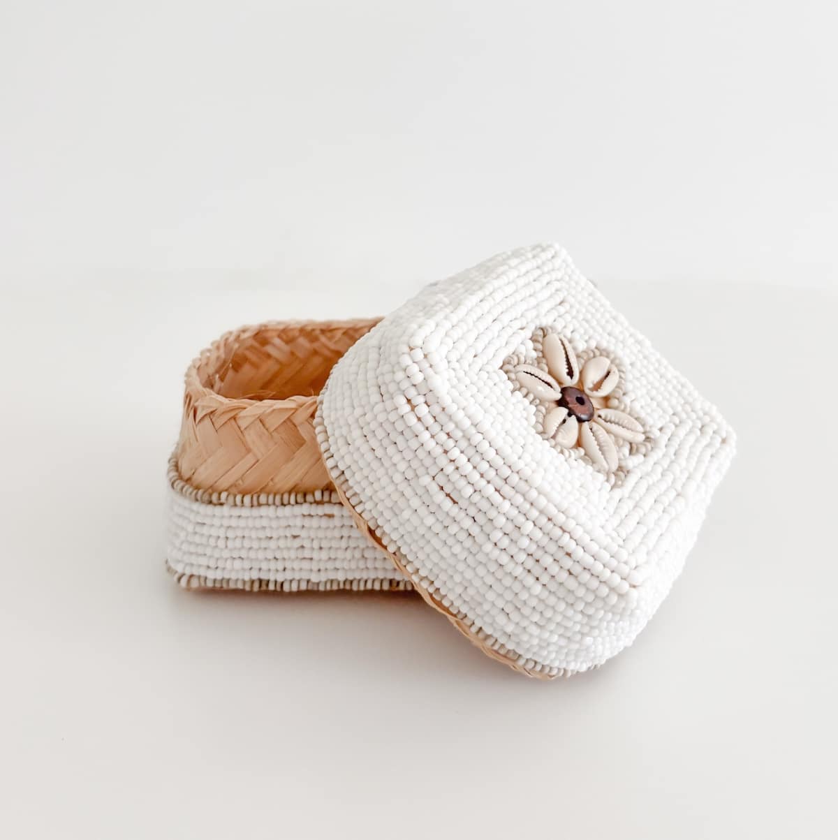 OPRINDELSE: Æsken er håndflettet på Bali og hver perle er påsyet i hånden. Selve æske typen anvendes oprindeligt til opbevaring af ris og andre madvarer mens den med perler påsyet anvendes til pynt og opbevaring af småting