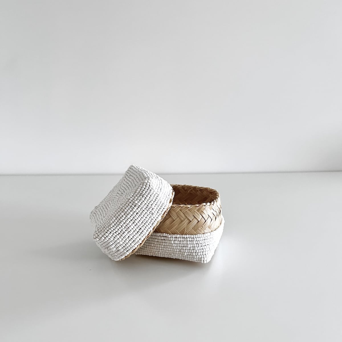 OPRINDELSE: Æsken er håndflettet på Bali og hver perle er påsyet i hånden. Selve æske typen anvendes oprindeligt til opbevaring af ris og andre madvarer mens den med perler påsyet anvendes til pynt og opbevaring af småting
