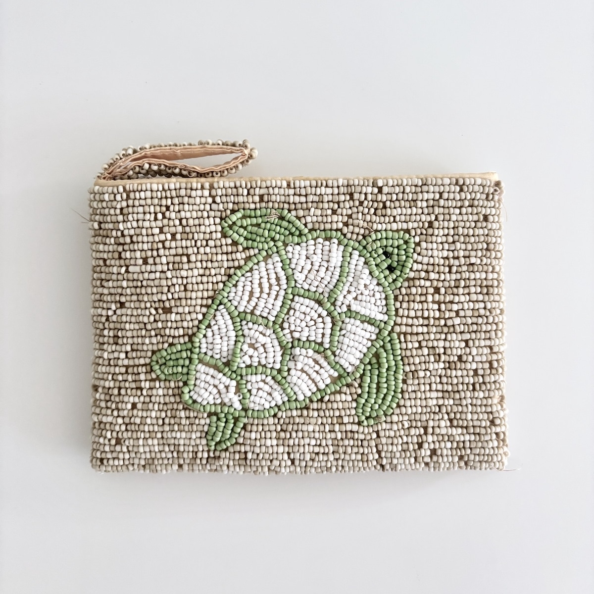Fin, unik og lille perlepung med lynlås og bladmønster. Pungen er håndflettet på Bali af lokale kvinder, som sirligt har påsyet hver eneste perle i hånden. Pungen er god til opbevaring af små ting eller mønter på ferien, så de ikke bliver væk i en større taske.