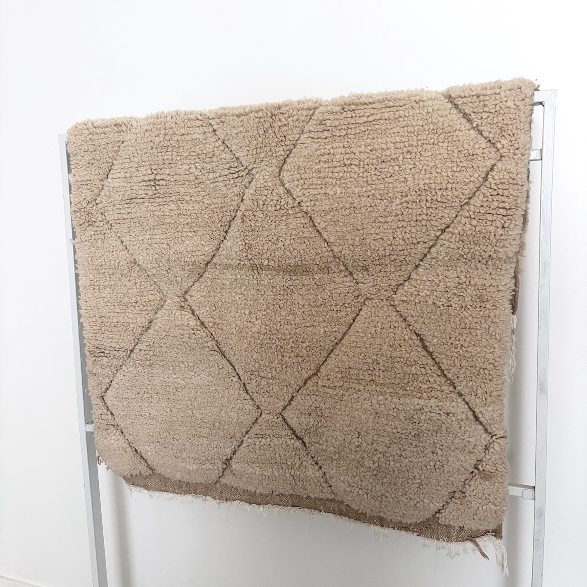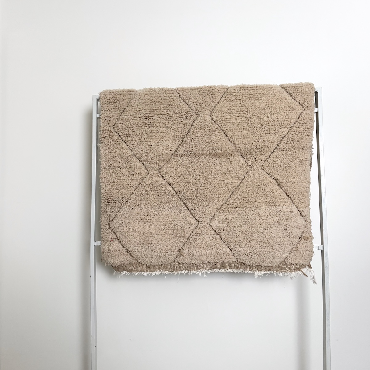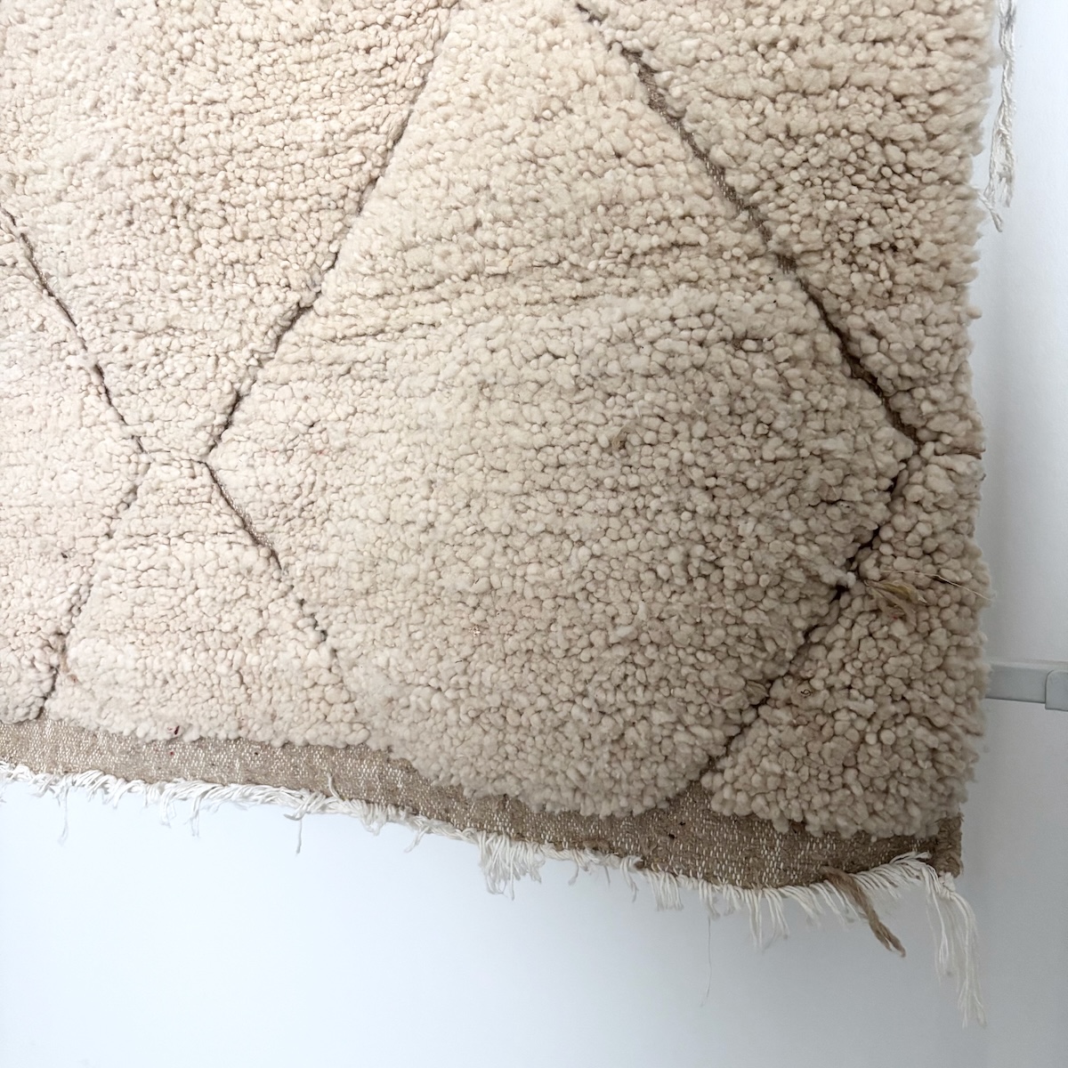 Det lækre lille Beni Ouarain mini gulvtæppe fra Marokko er håndvævet i 100% ren fåreuld. Beni Ouarain kendes her i Skandinavien typsisk for de råhvide gulvtæpper indvævet med sorte rudetern, der typisk er fortolkninger af de omkringliggende Atlasbjerge. Men på dette tæppe har den kvindelige væver valgt at holde tæppet i ren hvid uld med aftegninger af de klassiske rudetern samt en bort i begge ender.