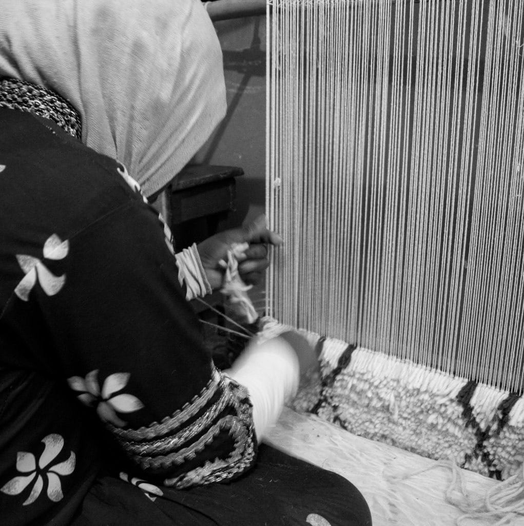 Håndvævet af kvinder i Beni Ouarain stammerne i små landsbyer i Atlasbjergene, Marokko.