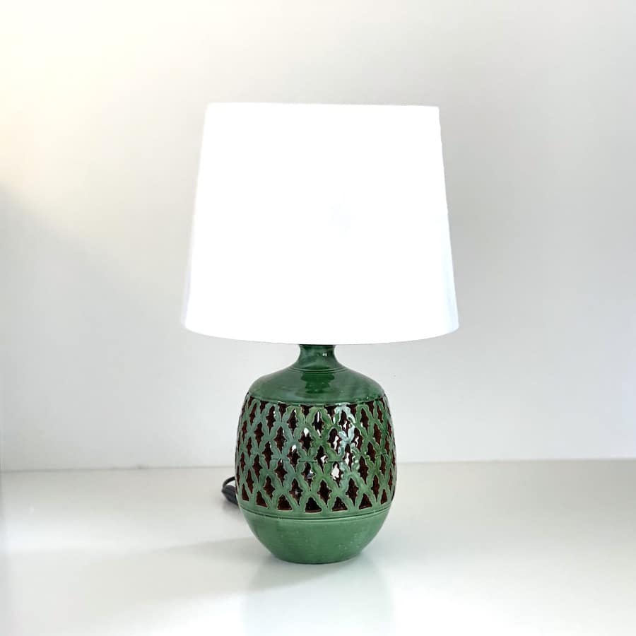Calada bordlampe i keramik – unika mønster LAMPEFODENS STØRRELSE: Medium H35 x Ø 18 cm (fåes også i andre størrelser) MATERIALE: Håndlavet keramik FARVER: Flaskegrøn (fås også i hvid og curry) OPRINDELSE: Lampefoden er håndlavet i det sydlige Spanien som et miks af gamle Andalusiske og Nordafrikanske mønstre, farver og traditioner. ENERGY: Keramik styrker vores jordforbindelse. Den grønne farve styrker vores Hjerte chakra for større kærlighed, empati, varme, omsorg mm. MEDFØLGER: Sort elektrisk fatning E27 standard størrelse til elpærer med bred sokkel. Sort ledning @1,20 m. med tænd og sluk knap. Lampeskærm sælges separat. Den viste lampeskærm er Model ‘Classic’ Ø30 cm. – håndsyet i 100% hvid bomuld: H23xØ24 cm. Vi har mange forskellige faconer, tekstiler og farver. Ring gerne på 2922 8923 hvis du har spørgsmål eller særlige ønsker:) Calada bordlampe i keramik – unika mønster