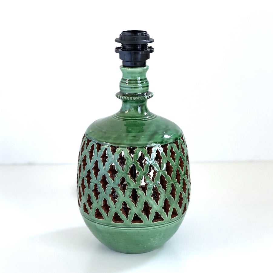 SKØN grøn unika bordlampe som emmer af de sydspanske traditioner for smukke udformninger og farver. Lampefoden er håndlavet af en lokal keramiker i en lille workshop i det sydlige Spanien. Familien har igennem 5 generationer crafted det smukkeste keramik baseret på et miks af gamle, stolte spanske samt nordafrikanske traditioner, farver og mønstre.