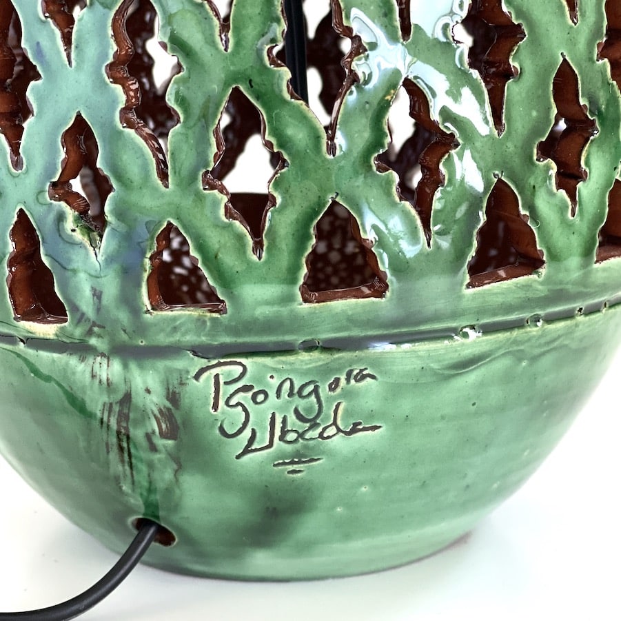 Hvert eneste mønster er manuelt udskåret og formet. Og som en ekstra charmerende detalje har den lokale keramiker skrevet sin signatur på lampen.