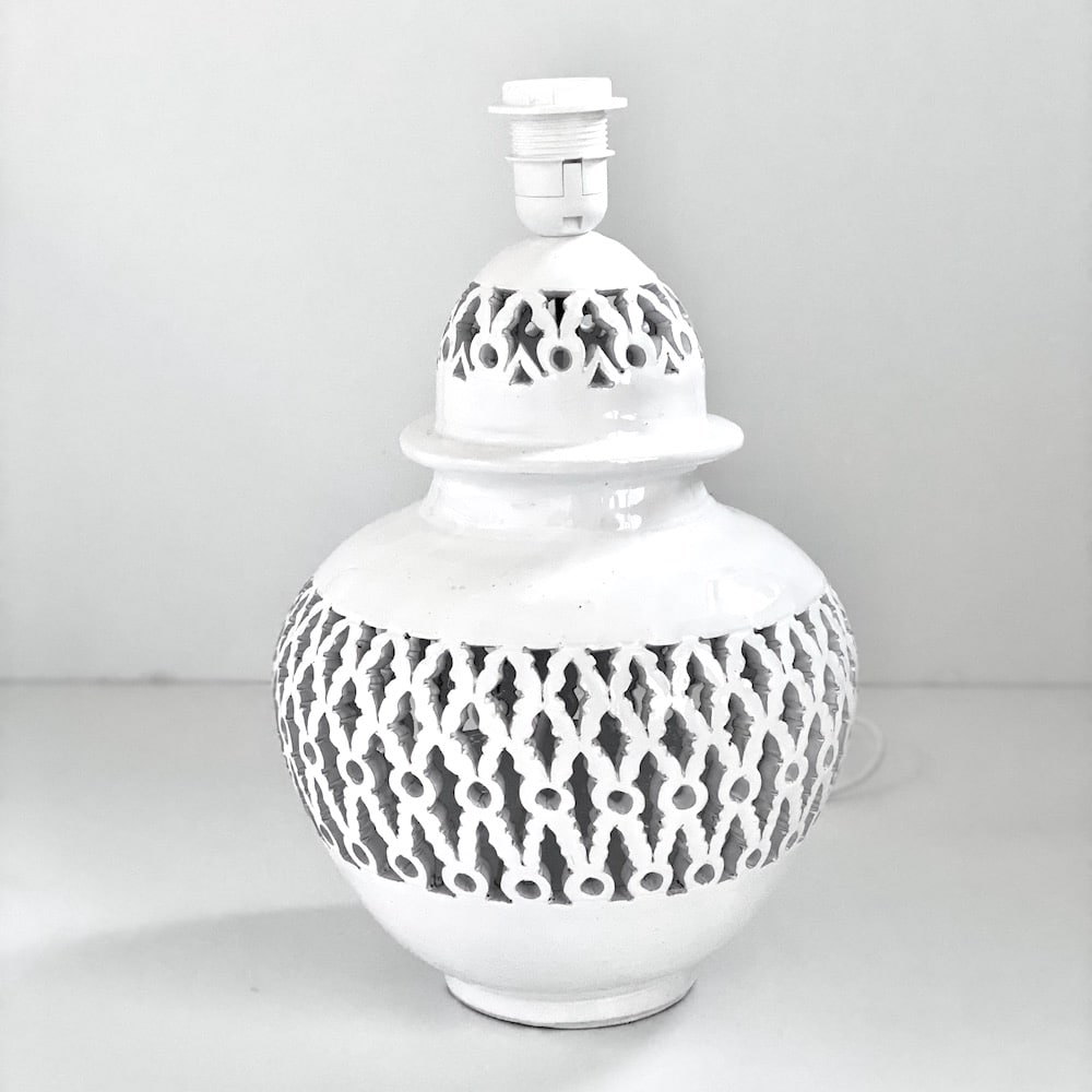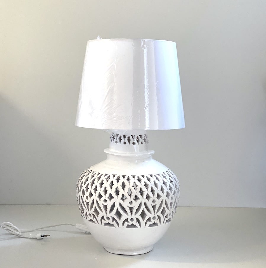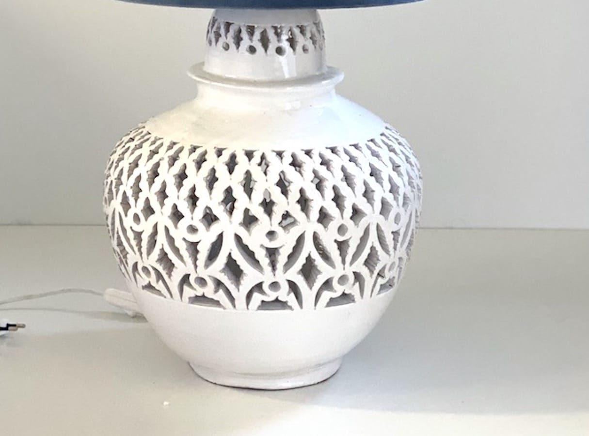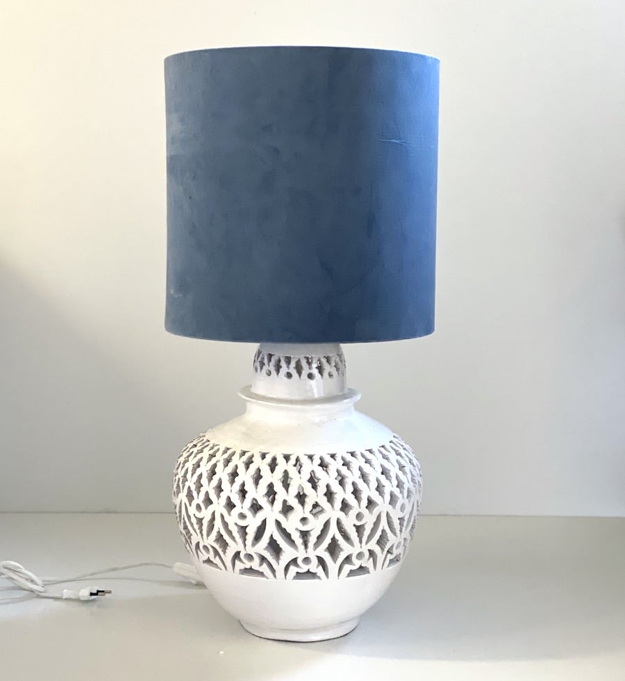 SKØN stor unika bordlampe i keramik, håndlavet i Andalucien efter gamle traditioner. Lampefoden er håndlavet af en lokal keramiker i en lille workshop i det sydlige Spanien. Familien har igennem 5 generationer crafted det smukkeste keramik baseret på et miks af gamle, stolte spanske samt nordafrikanske traditioner, farver og mønstre.