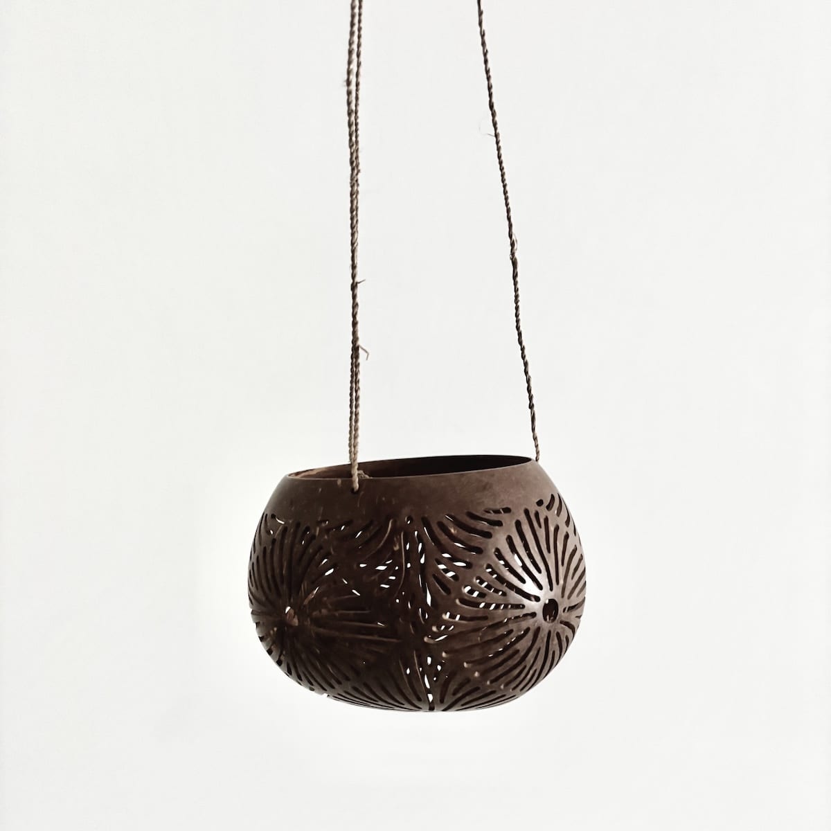 MATERIALE: Fremstillet af skallen fra en ægte kokosnød. Stagen er udstyret med 3 naturfarvede snore bundet sammen foroven til ophæng