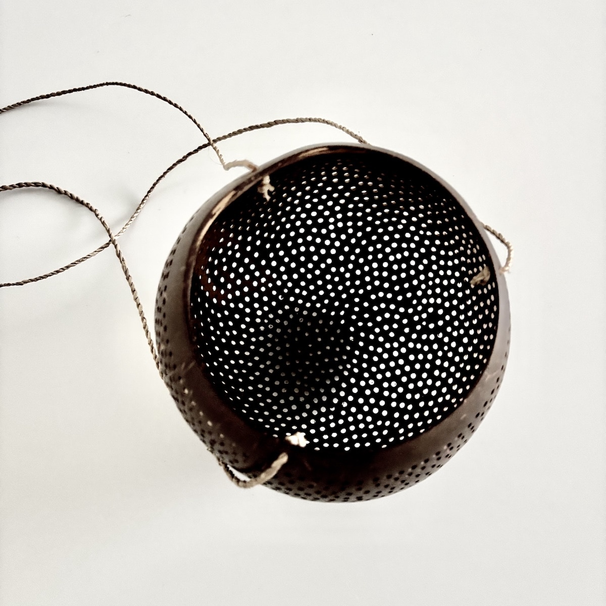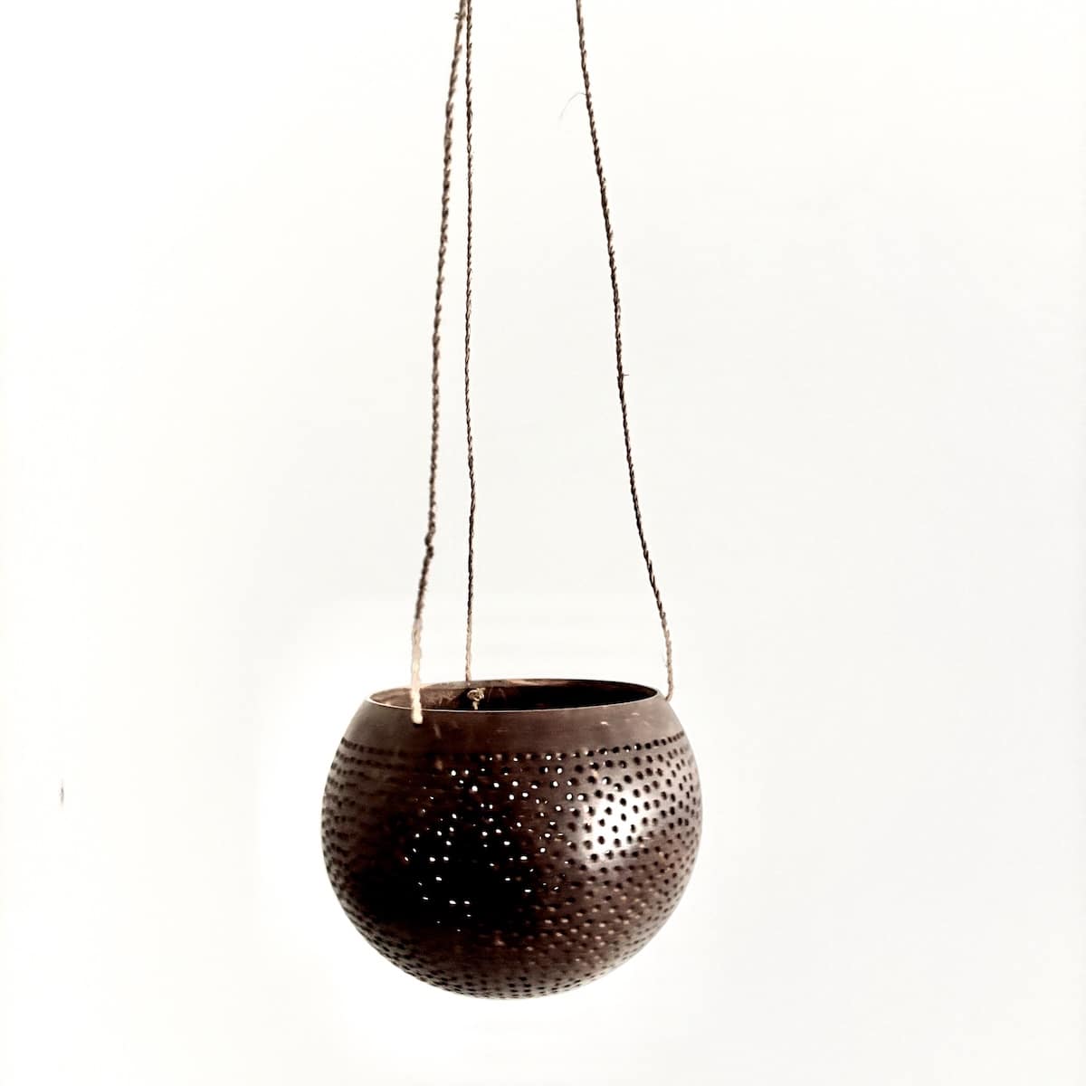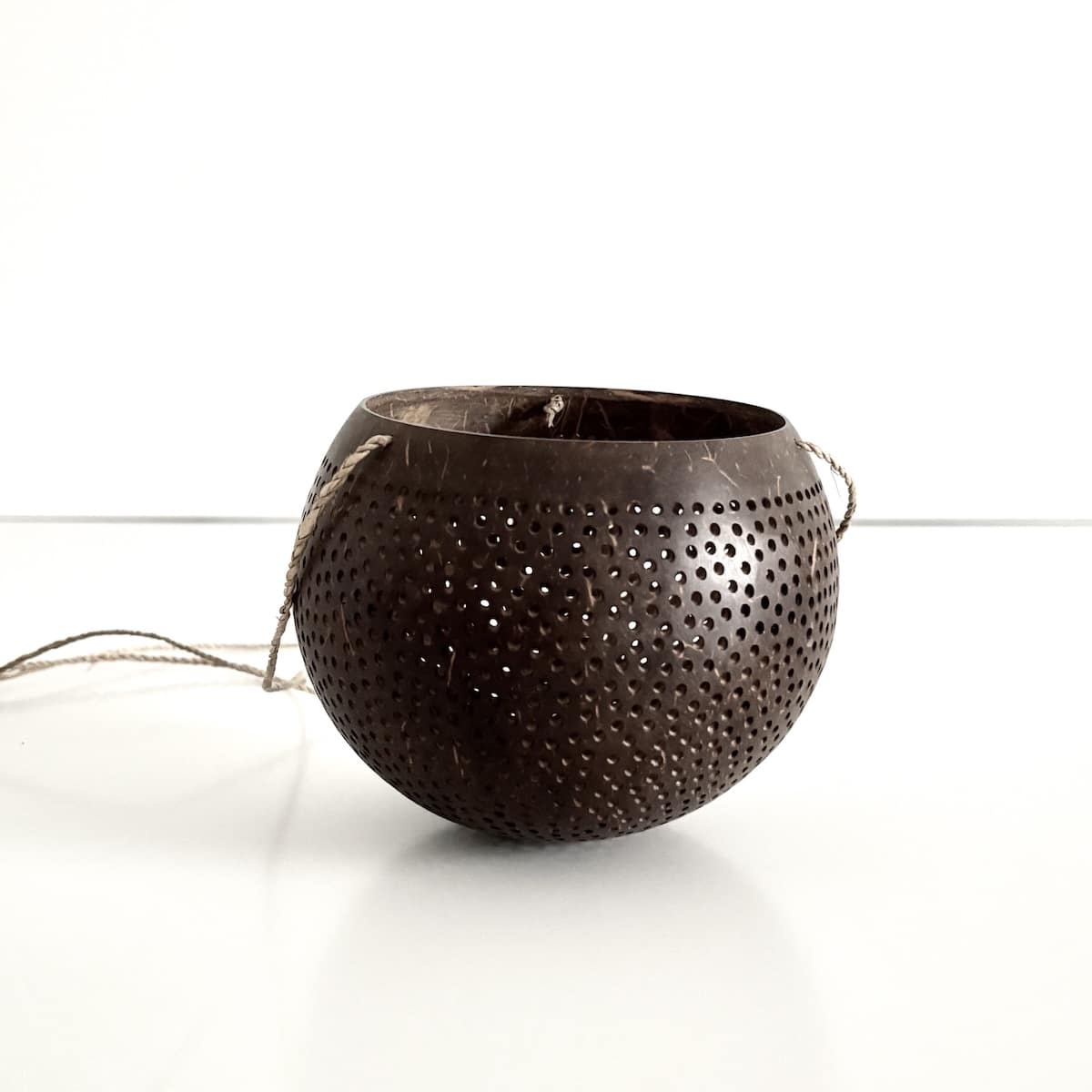 MATERIALE: Fremstillet af skallen fra en ægte kokosnød. Stagen er udstyret med 3 naturfarvede snore bundet sammen foroven til ophæng