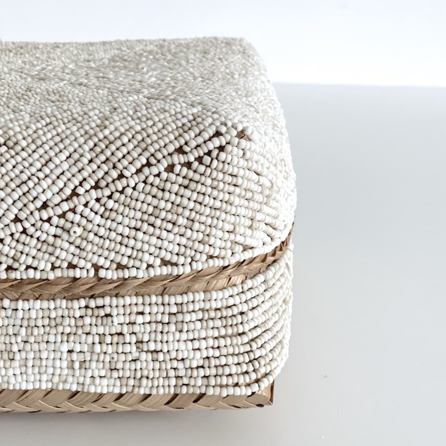 OPRINDELSE: Æsken er håndflettet på Bali og hver perle er påsyet i hånden. Selve æsken anvendes oprindeligt til opbevaring af ris og andre madvarer mens den med perler påsyet anvendes til opbevaring af forskellige ting fra dagligdagen.