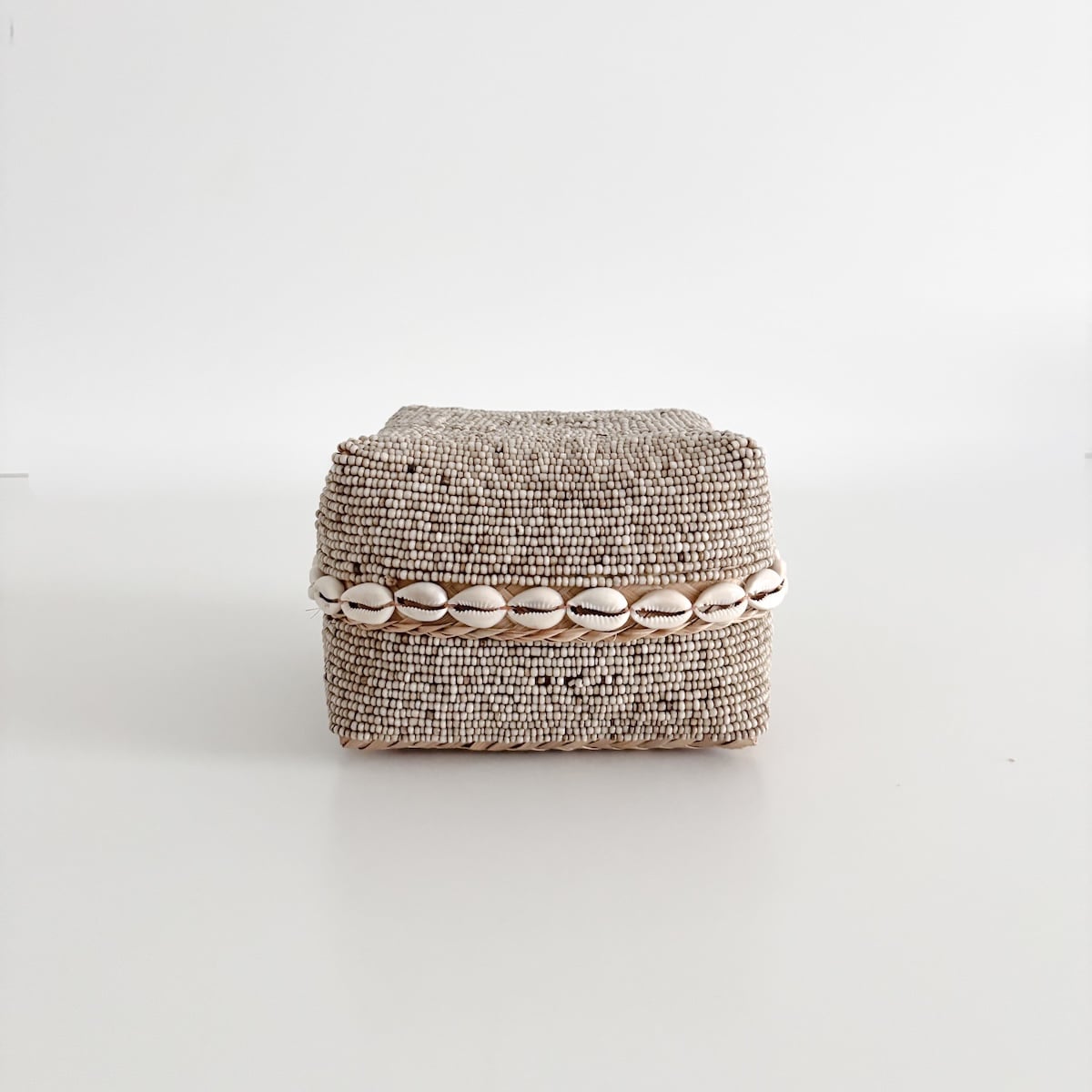 Den smukke kurveæske fra Bali er håndflettet af lokale kvinder i palmeflet med små fine perler samt ægte, certificerede konkylier fra de Indonesiske strande påsyet i hånden. Kurvetypen bliver oprindeligt anvendt som opbevaring af ris og andre madvarer og med de små perler strøet ud over æskens yderside bliver den utroligt dekorativ at have stående i hjemmet som opbevaring af stort set alt. Brug den til pigeting på badeværelse, til fyrfads-/stearinlys i køkkenet eller stuen, fyld den op med tusser, småting og andet på børneværelset, strømper, o.s.v.