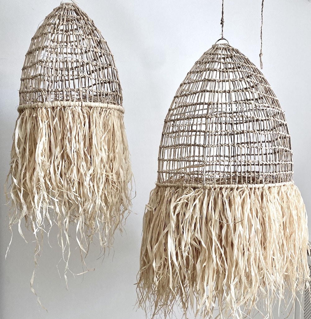 Hvis du elsker boheme stemning og sommer vibes så tag et kig på den her lampe. Rumbai boho kurvelampen er håndlavet på Bali. Lange sisal planefibre er håndflettet rundt om et robust metalstativ. Rumbai navnet kommer fra de lange frynser, der på indonesisk betyder frynse kvaster. De lange frynser gør lamperne helt unikke. Hæng lampen indenfor alene eller sammen med den større lampe som et par. Du kan også hænge den udenfor hvor de lange frynser vil flagre dejligt i vinden.