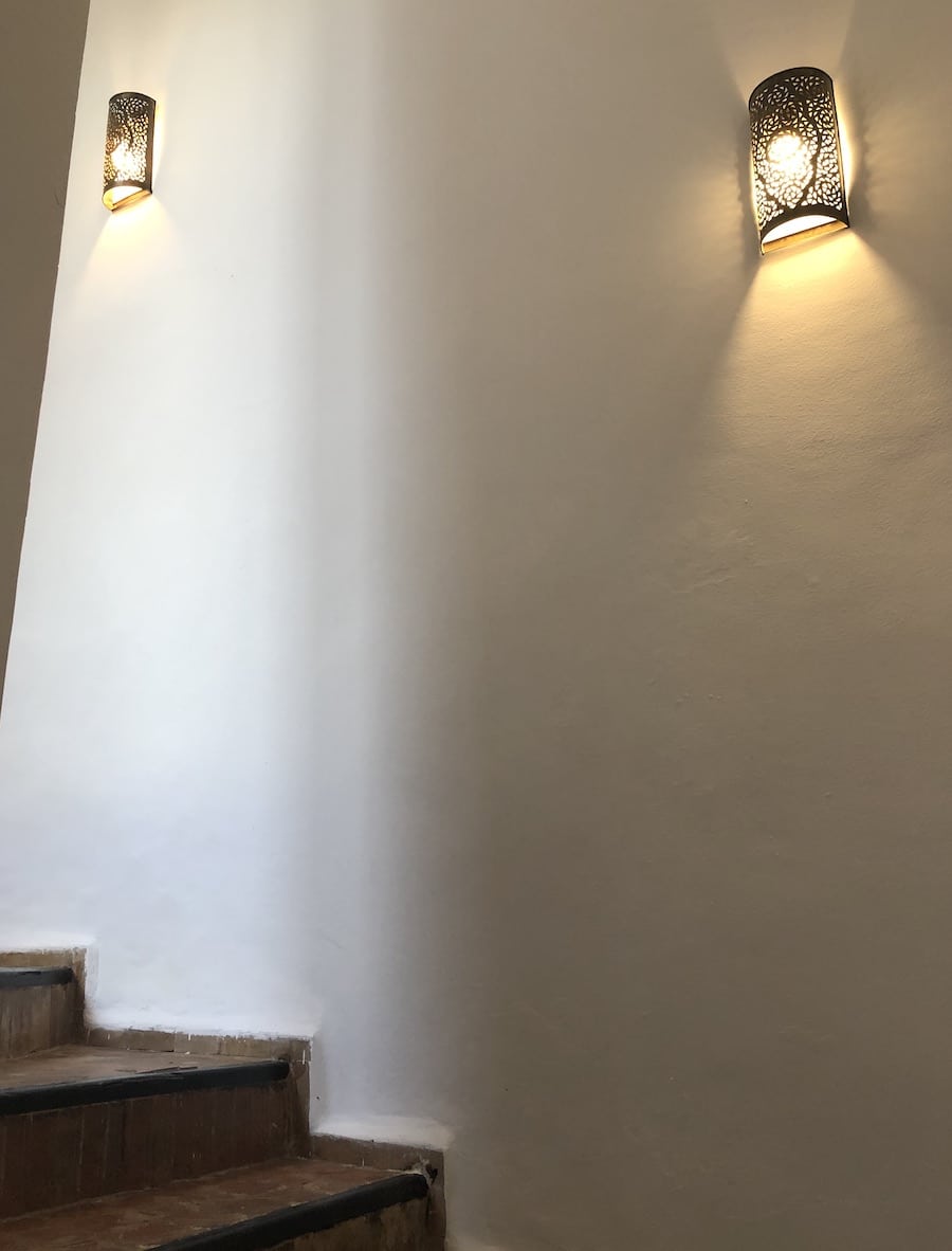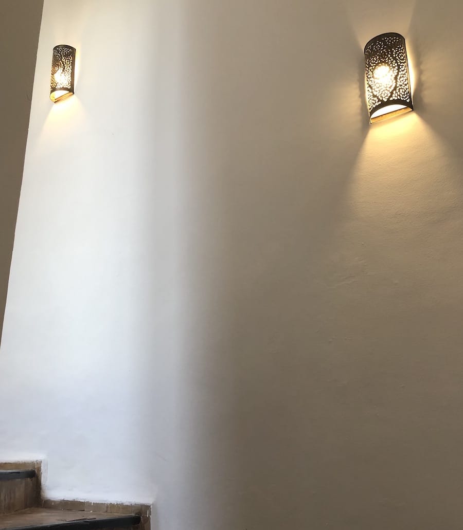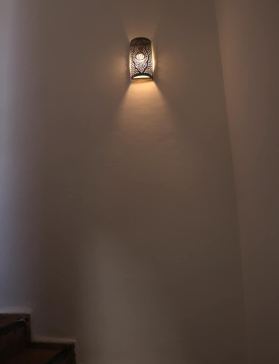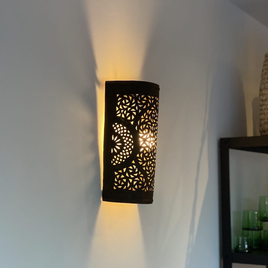 Den charmerende aflange væglampe er håndlavet i kobbermessing af 2 brødre i en lille, Marrokansk shop. Den anvendes typiske som lyskilde i de lokale huse og Riads i Marokko. Lampen giver et hyggeligt lys der både strømmer ud i toppen op bunden af skærmen samt via bagsiden af lampen og igennem de smukke udskæringer. Hæng en eller flere lamper på væggen i entréen, i trappeopgangen i stuen, på badeværelset, i køkkenet…
