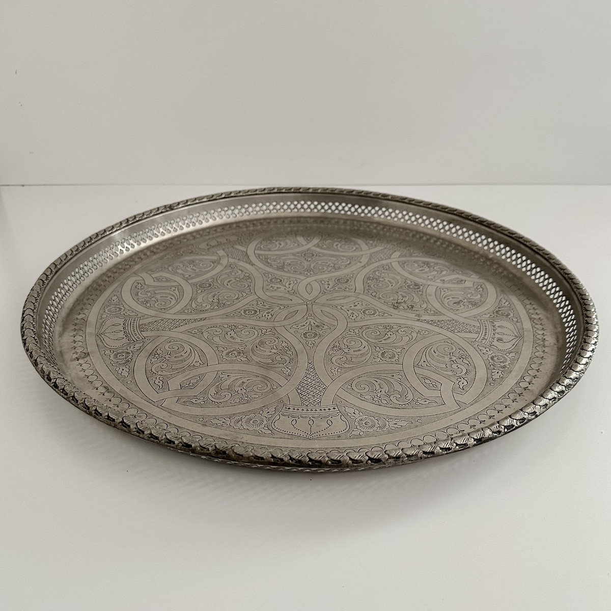 Det smukke marokkanske fad er minimum 60 år gammelt og håndlavet i nysølv/nikkelsølv! Her er tale om et UNIKA fund fyldt med masser af historie og sjæl!