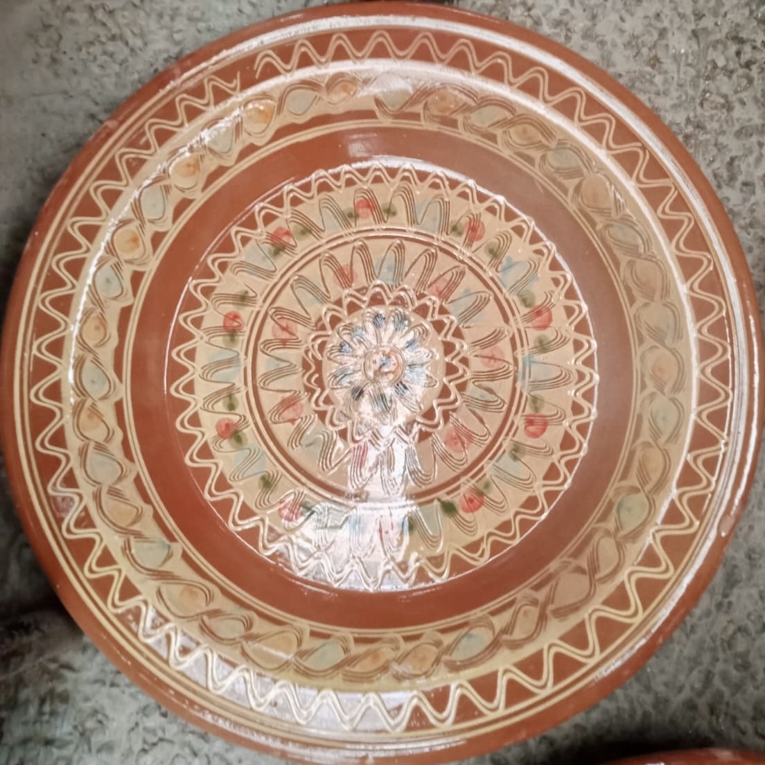 FARVER: Naturligt okkerfarvet ler fra Marrakech – den røde by. På oversiden er påført en kraftig glasur med en bund i varm okkerfarve og smukke mønstre påmalet i bløde farver. Bagsiden er ren rødlig ler.