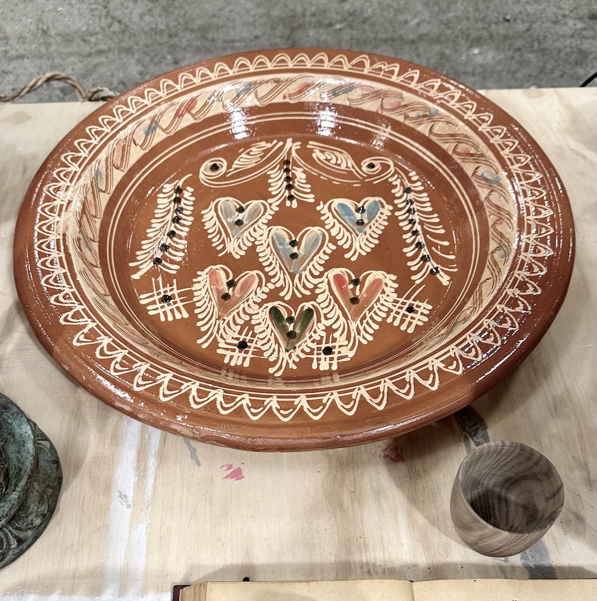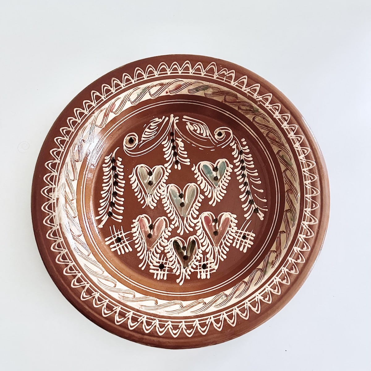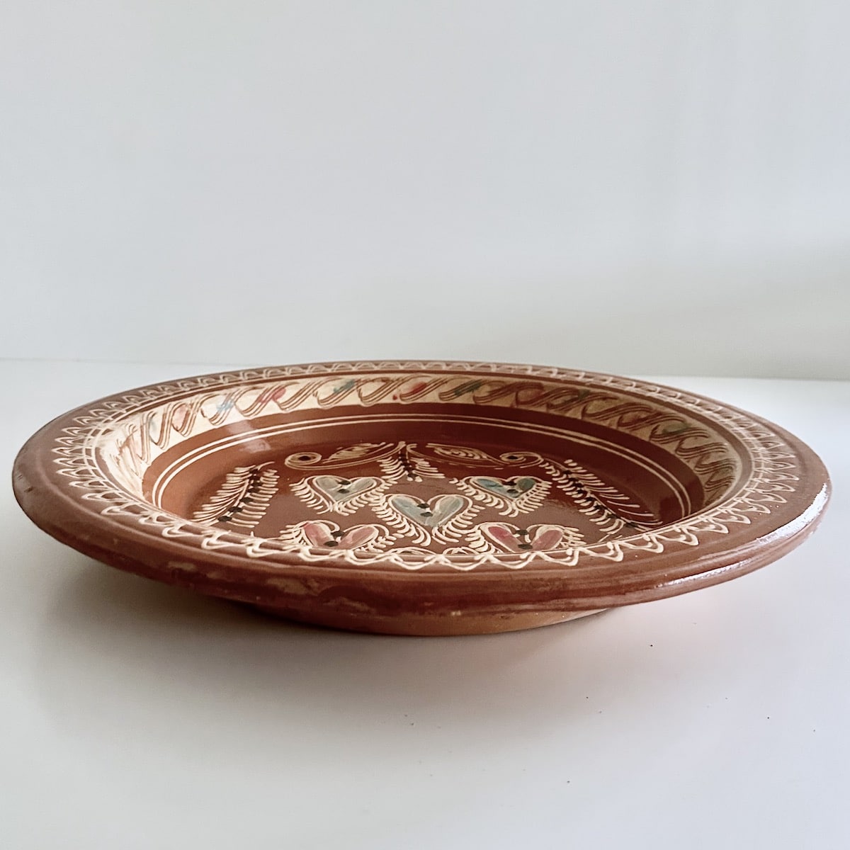FARVER: Naturligt okkerfarvet ler fra Marrakech – den røde by. På oversiden er påført en kraftig glasur med en bund i varm okkerfarve og hjerter påtegnet i bløde farver og hvid fjerdeko. Bagsiden er ren rødlig ler.
