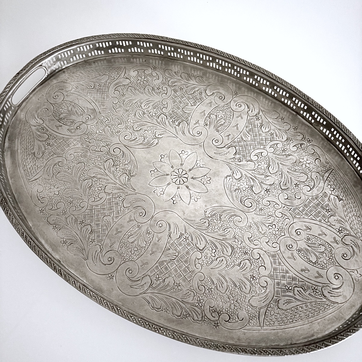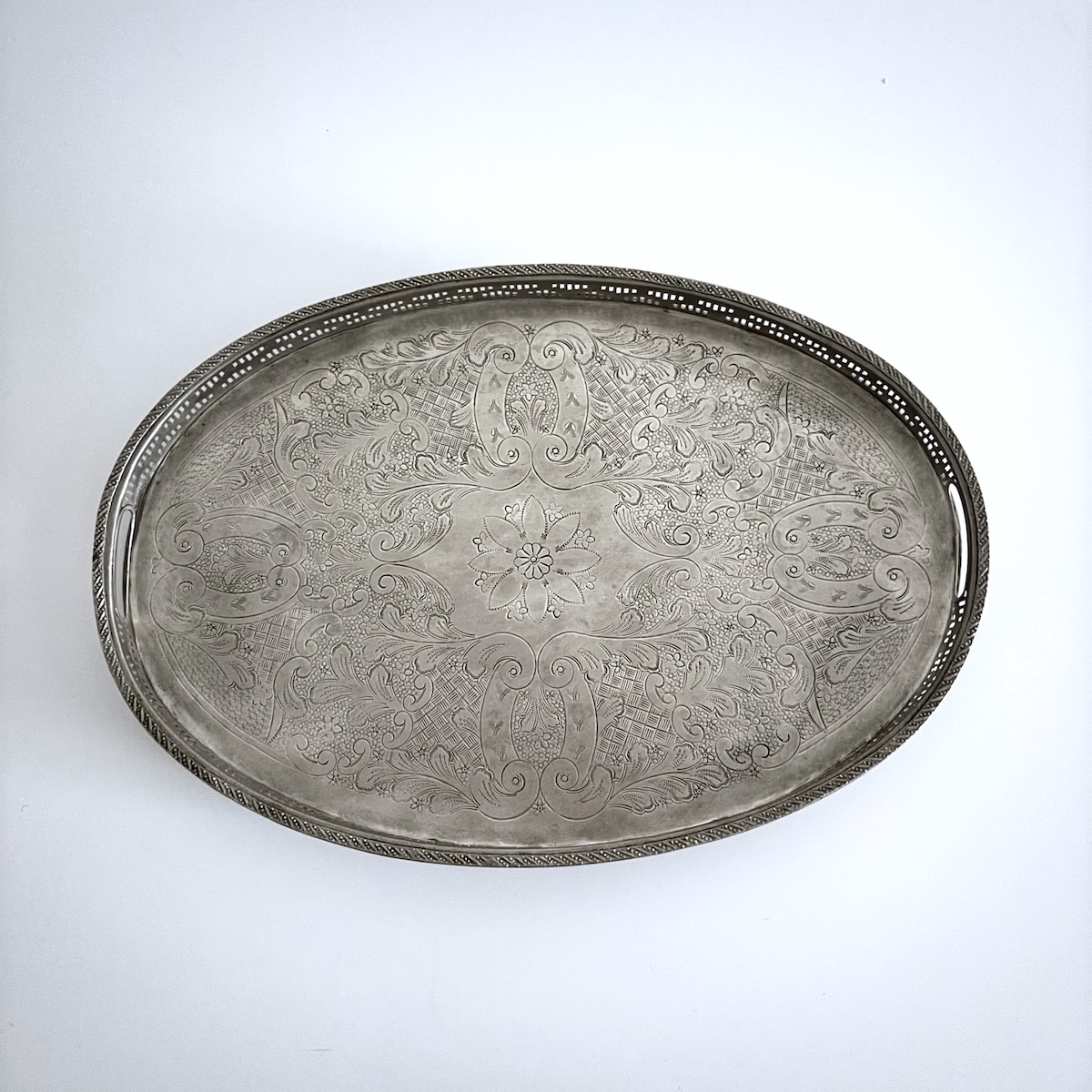 Vintage serveringsbakke oval m/fødder – nysølv STØRRELSE: OVAL form. Cirka L50 x B35  x H7 cm. VÆGT: Ca. 2 kg MATERIALE: Håndlavet i gammelt nikkelsølv, der er en unik legering af primært kobber samt nikkel og zink, bly, tin og jern. Farven kendes som den smukke, klassiske ‘sølvfarve’. UNIKA FUND!! OPRINDELSE: Vintage serveringsbakke fra en gammel husstand i Marokko – minimum 60 år gammel. Håndlavet efter gamle traditioner af en lokal håndværker i Marokko. Opkøbt og istandsat i en lokal familieejet workshop i Marrakesh. VEDLIGEHOLDELSE: Det kobberbaserede materiale får en naturlig, mat belægning, hvis man vælger ikke at pudse det op. Det matte look har sin egen, rustikke charme, der passer godt til den skandinaviske, lyse indretning. Ønsker du at bevare den blanke overflade, kan du pudse fadet med en klud, en svamp med den grønne side nedad eller med ståluld samt en tyk brun sæbe (den der købes i en bøtte). Brug rigelig med sæbe, når du pudser – så undgår du at fadet bliver ridset. Er fadet blevet meget mørkt eller plettet plejer de lokale marokkanere tillige at smøre fadet med 1/2 citron. Lad eventuelt saften trække lidt sammen med en brun sæbe, hvorefter du kan pudse fadet med ståluld eller svamp og skylle efter med vand. NOTE: Alle vores Marokkanske vintage fade og bakker er unikke med forskellige mønstre og forskellig patina. Hvert fad og hver bakke taler sin egen historie med charmerende ridser og slid i mønstre samt belægning. Ikke 2 er ens! BEMÆRK: Vælger du at bruge bakken til mad tilrådes det at bruge et mellemlagspapir, så maden ikke kommer i direkte kontakt med kobbermaterialet. FØL ENERGIEN fra 1001 nats eventyr i det gamle Marokko og forestil dig, hvordan de smukke fade blev brugt til at servere dejlig pebermynte the og andet lækkert til gæster i de Marokkanske hjem. Metal elementet bidrager i de rette doser til struktur, renhed og klarhed i hjemmet samt hjælper personlige visioner, rigdom og indre styrke.