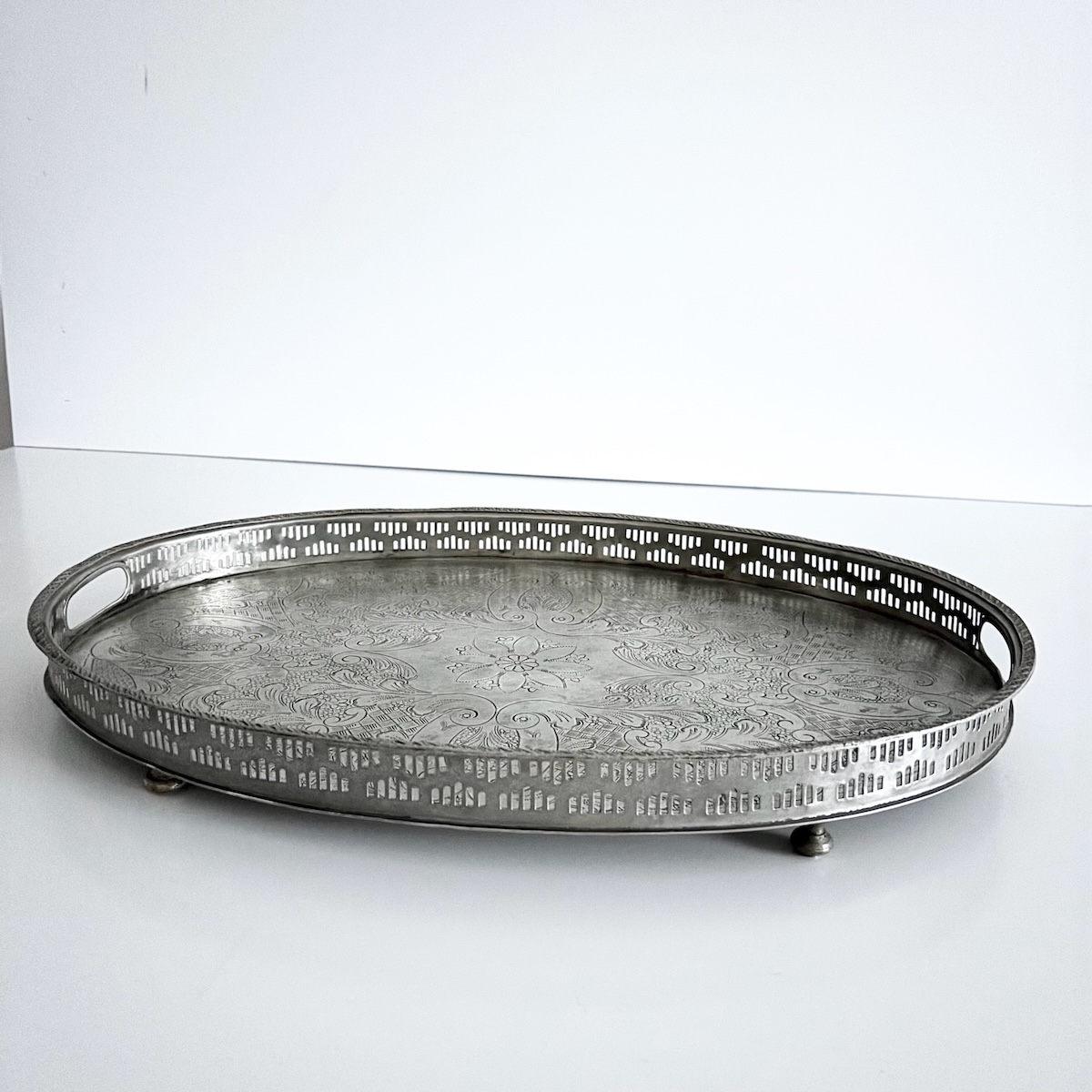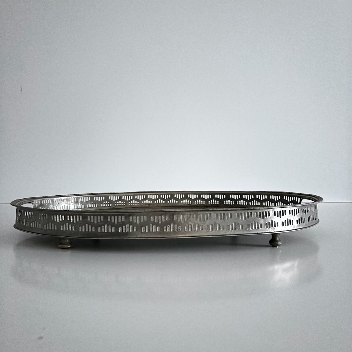 Vintage serveringsbakke oval m/fødder – nysølv