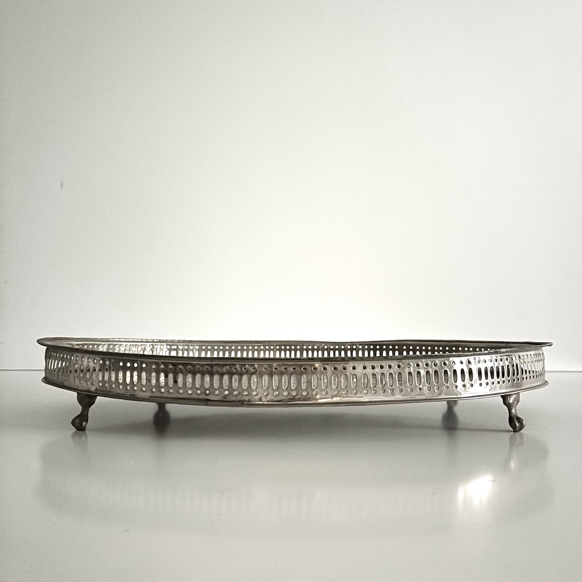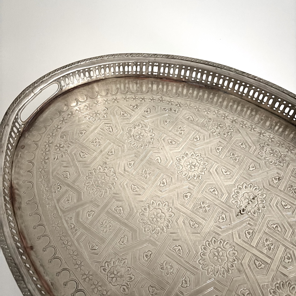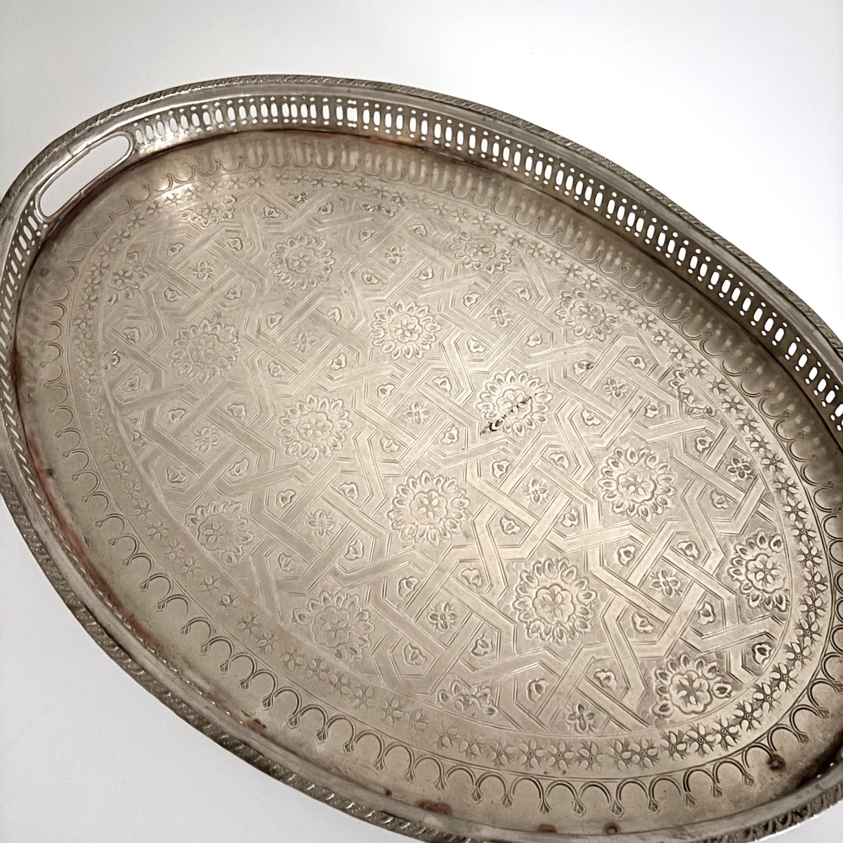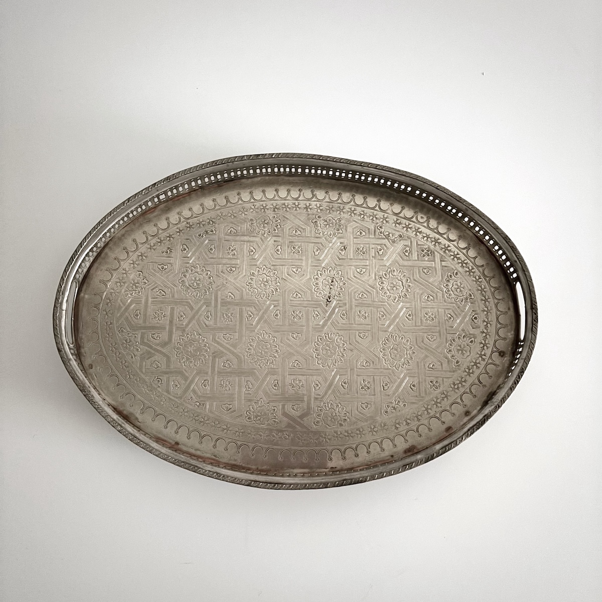Vintage serveringsbakke oval m/fødder – nysølv STØRRELSE: OVAL form. Cirka L50 x B35  x H7 cm. VÆGT: Ca. 2 kg MATERIALE: Håndlavet i gammelt nikkelsølv, der er en unik legering af primært kobber samt nikkel og zink, bly, tin og jern. Farven kendes som den smukke, klassiske ‘sølvfarve’. UNIKA FUND!! OPRINDELSE: Vintage serveringsbakke fra en gammel husstand i Marokko – minimum 60 år gammel. Håndlavet efter gamle traditioner af en lokal håndværker i Marokko. Opkøbt og istandsat i en lokal familieejet workshop i Marrakesh. VEDLIGEHOLDELSE: Det kobberbaserede materiale får en naturlig, mat belægning, hvis man vælger ikke at pudse det op. Det matte look har sin egen, rustikke charme, der passer godt til den skandinaviske, lyse indretning. Ønsker du at bevare den blanke overflade, kan du pudse fadet med en klud, en svamp med den grønne side nedad eller med ståluld samt en tyk brun sæbe (den der købes i en bøtte). Brug rigelig med sæbe, når du pudser – så undgår du at fadet bliver ridset. Er fadet blevet meget mørkt eller plettet plejer de lokale marokkanere tillige at smøre fadet med 1/2 citron. Lad eventuelt saften trække lidt sammen med en brun sæbe, hvorefter du kan pudse fadet med ståluld eller svamp og skylle efter med vand. NOTE: Alle vores Marokkanske vintage fade og bakker er unikke med forskellige mønstre og forskellig patina. Hvert fad og hver bakke taler sin egen historie med charmerende ridser og slid i mønstre samt belægning. Ikke 2 er ens! BEMÆRK: Vælger du at bruge bakken til mad tilrådes det at bruge et mellemlagspapir, så maden ikke kommer i direkte kontakt med kobbermaterialet. FØL ENERGIEN fra 1001 nats eventyr i det gamle Marokko og forestil dig, hvordan de smukke fade blev brugt til at servere dejlig pebermynte the og andet lækkert til gæster i de Marokkanske hjem. Metal elementet bidrager i de rette doser til struktur, renhed og klarhed i hjemmet samt hjælper personlige visioner, rigdom og indre styrke.