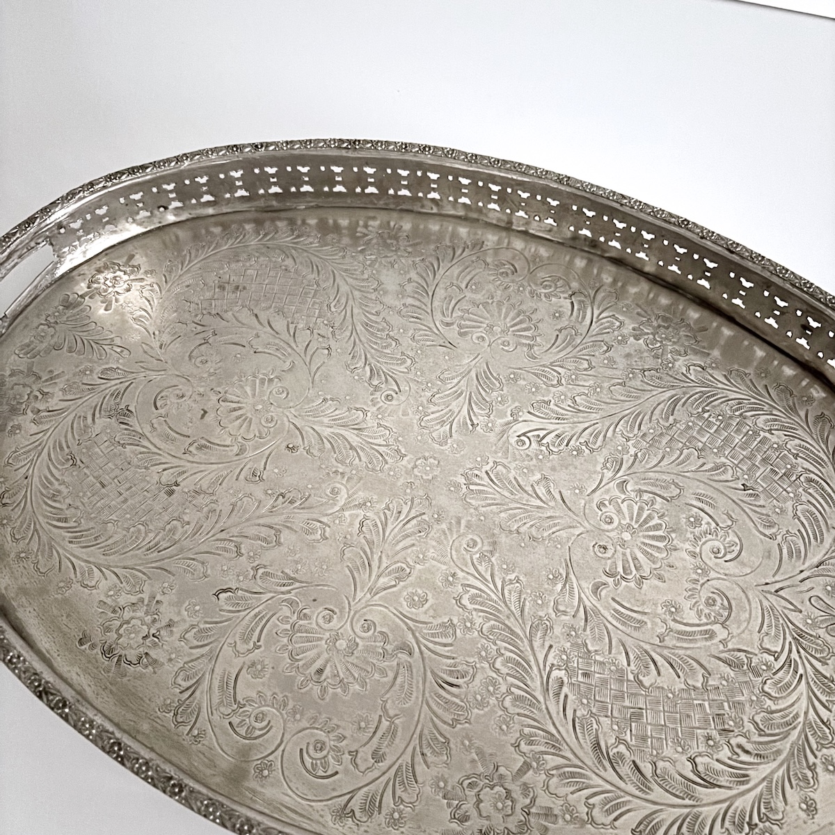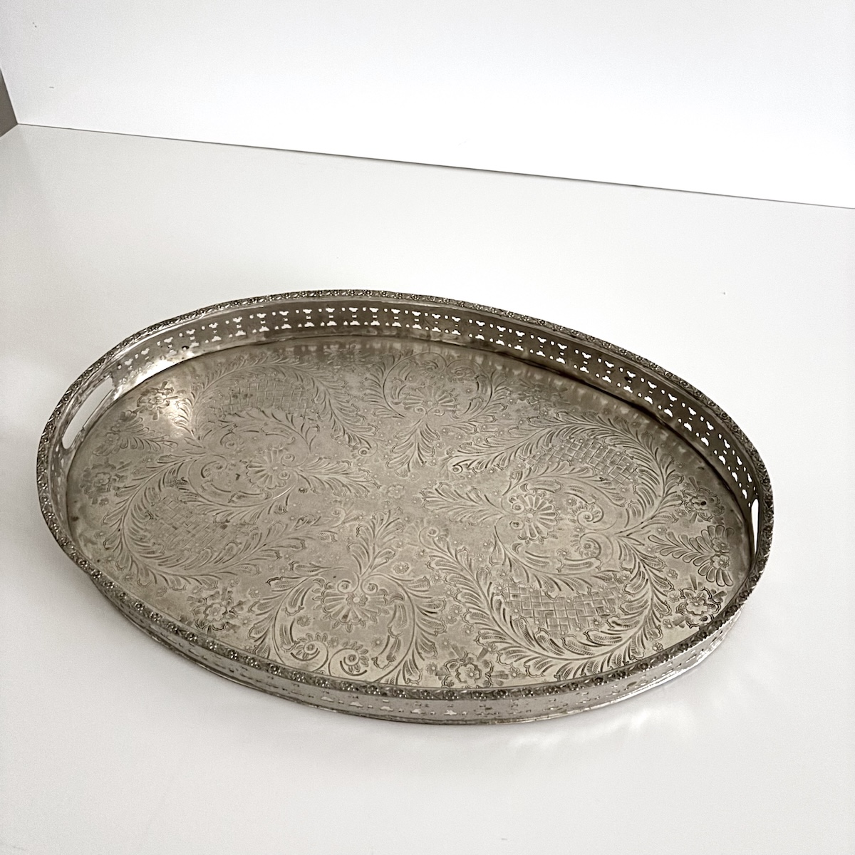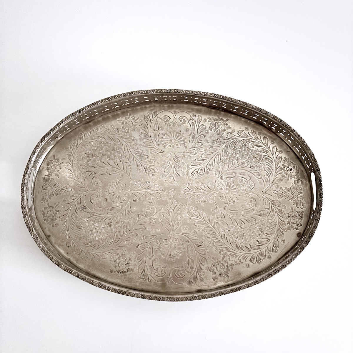 Vintage serveringsbakke oval – nysølv m/messing STØRRELSE: OVAL form. @L50 x B 35  x H5 cm. VÆGT: Ca. 1,5 kg MATERIALE: Håndlavet i gammelt nysølv/nikkelsølv, der er en unik legering af primært kobber samt nikkel og zink, bly, tin og jern. Farven kendes som den smukke, klassiske ‘sølvfarve’. Kanten er messing belagt. OPRINDELSE: Vintage serveringsbakke fra en gammel husstand i Marokko – minimum 60 år gammel. Håndlavet efter gamle traditioner af en lokal håndværker i Marokko. Opkøbt og istandsat i en lokal familieejet workshop i Marrakesh. VEDLIGEHOLDELSE: Messing får over tid en naturlig, mat belægning, hvis man vælger ikke at pudse det op. Det matte look har sin egen, rustikke charme, der passer godt til den skandinaviske, lyse indretning. Ønsker du at bevare den blanke overflade, kan du pudse fadet mere eller mindre blankt med en klud, en svamp med den grønne side nedad eller med ståluld samt en tyk brun sæbe (den der købes i en bøtte). Brug rigelig med sæbe, når du pudser – så undgår du at fadet bliver ridset. Er fadet blevet meget mørkt eller plettet plejer de lokale marokkanere tillige at smøre fadet med 1/2 citron. Lad eventuelt saften trække lidt sammen med en brun sæbe, hvorefter du kan pudse fadet med ståluld eller svamp og skylle efter med vand. NOTE: Alle vores Marokkanske vintage fade og bakker er unikke med forskellige mønstre og forskellig patina. Hvert fad og hver bakke taler sin egen historie med charmerende ridser og slid i mønstre samt belægning. Ikke 2 er ens! BEMÆRK: Vælger du at bruge bakken til mad tilrådes det at bruge et mellemlagspapir, så maden ikke kommer i direkte kontakt med kobbermaterialet. FØL ENERGIEN fra 1001 nats eventyr i det gamle Marokko og forestil dig, hvordan de smukke fade blev brugt til at servere dejlig pebermynte the og andet lækkert til gæster i de Marokkanske hjem. Metal elementet bidrager i de rette doser til struktur, renhed og klarhed i hjemmet samt hjælper personlige visioner, rigdom og indre styrke.