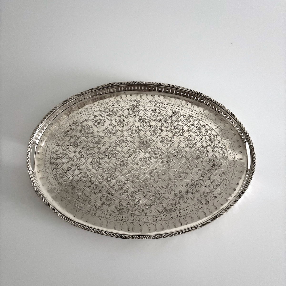 Vintage serveringsbakke oval – nysølv m/messing STØRRELSE: OVAL form. @L50 x B 35  x H5 cm. VÆGT: Ca. 1,5 kg MATERIALE: Håndlavet i gammelt nysølv/nikkelsølv, der er en unik legering af primært kobber samt nikkel og zink, bly, tin og jern. Farven kendes som den smukke, klassiske ‘sølvfarve’. Kanten er messing belagt. OPRINDELSE: Vintage serveringsbakke fra en gammel husstand i Marokko – minimum 60 år gammel. Håndlavet efter gamle traditioner af en lokal håndværker i Marokko. Opkøbt og istandsat i en lokal familieejet workshop i Marrakesh. VEDLIGEHOLDELSE: Messing får over tid en naturlig, mat belægning, hvis man vælger ikke at pudse det op. Det matte look har sin egen, rustikke charme, der passer godt til den skandinaviske, lyse indretning. Ønsker du at bevare den blanke overflade, kan du pudse fadet mere eller mindre blankt med en klud, en svamp med den grønne side nedad eller med ståluld samt en tyk brun sæbe (den der købes i en bøtte). Brug rigelig med sæbe, når du pudser – så undgår du at fadet bliver ridset. Er fadet blevet meget mørkt eller plettet plejer de lokale marokkanere tillige at smøre fadet med 1/2 citron. Lad eventuelt saften trække lidt sammen med en brun sæbe, hvorefter du kan pudse fadet med ståluld eller svamp og skylle efter med vand. NOTE: Alle vores Marokkanske vintage fade og bakker er unikke med forskellige mønstre og forskellig patina. Hvert fad og hver bakke taler sin egen historie med charmerende ridser og slid i mønstre samt belægning. Ikke 2 er ens! BEMÆRK: Vælger du at bruge bakken til mad tilrådes det at bruge et mellemlagspapir, så maden ikke kommer i direkte kontakt med kobbermaterialet. FØL ENERGIEN fra 1001 nats eventyr i det gamle Marokko og forestil dig, hvordan de smukke fade blev brugt til at servere dejlig pebermynte the og andet lækkert til gæster i de Marokkanske hjem. Metal elementet bidrager i de rette doser til struktur, renhed og klarhed i hjemmet samt hjælper personlige visioner, rigdom og indre styrke.