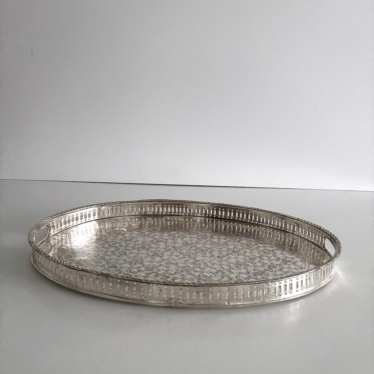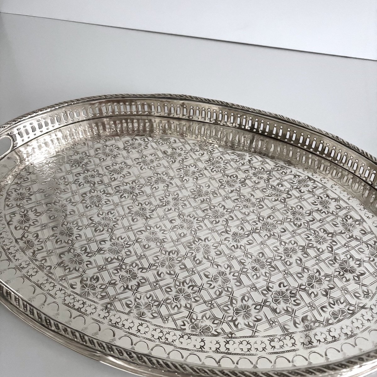 Vintage serveringsbakke oval – nysølv m/messing