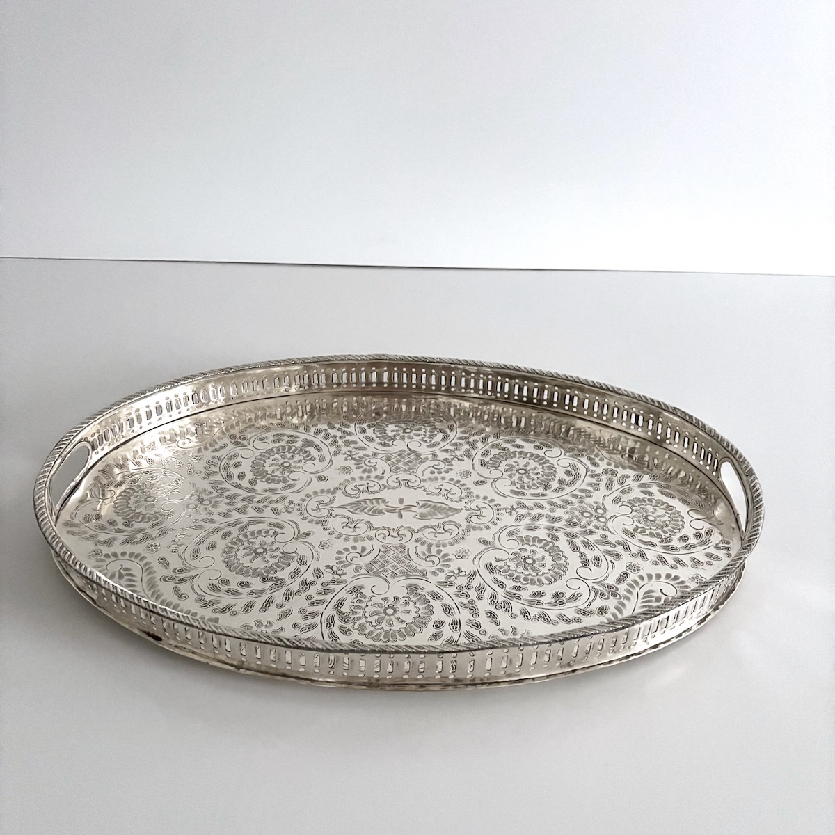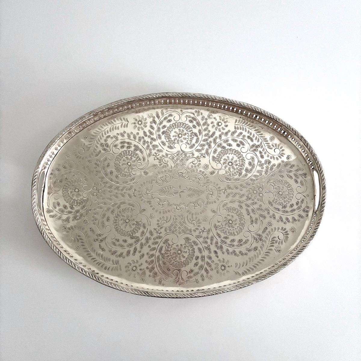 Vintage serveringsbakke oval – nysølv m/messing